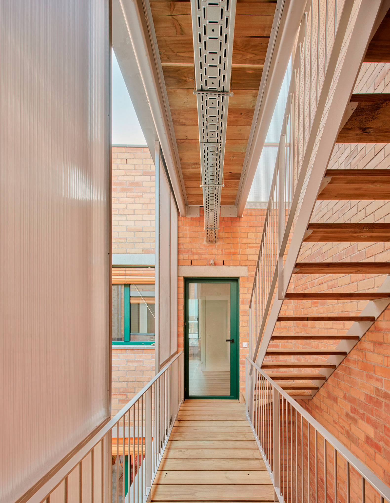 We worked with a traditional structure of load-bearing walls and floor slabs running in a single direction, with prefabricated rectangular beams. The construction is of structural brick manufactured in the county of Segrià, with the façades made from cavity brickwork with insulation and an air gap for ventilation. Using this system means the brick can be exposed on the outside and painted on the inside. Plaster ceilings, continuous concrete flooring on the ground floor, and parquet flooring on the first floor define the interior design. The staircase and walkways are a lightweight construction made from metal profiles and pressure-treated pine planks. The raw presence of the materials, with no cladding, is complemented by elements of different colors such as the green windows, the pastel mint kitchen and bathroom cabinetry, and the furniture that combines the warmth of natural wood with touches of bright colors (yellow, red and orange).