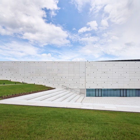 The mission of the newly opened Interactive OKO Story and Animation Center is to highlight the phenomenon of the Animated Film Studio. One element that symbolically links heritage with modernity is the minimalist façade made of architectural concrete with film tape-like perforations.