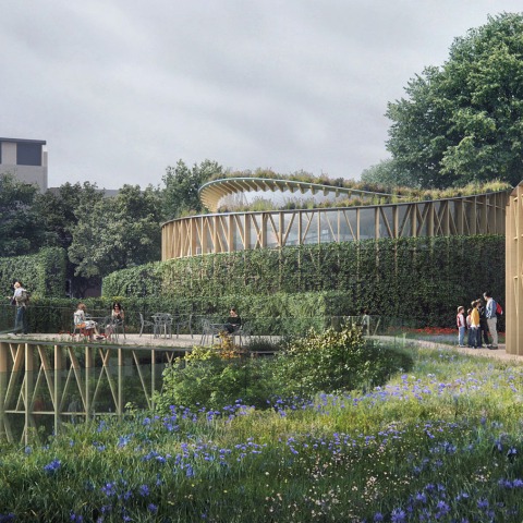 The museum spaces are composed by a series of circular forms that are tangent to each other like a chain. The continuous curve linear green wall expands and traces the underground space structure and defines the garden. It meanders and weaves in and out, above and under the ground throughout the site. In the sequence of intertwined spaces visitors will find themselves in between outside and inside as the green wall appears and disappears.