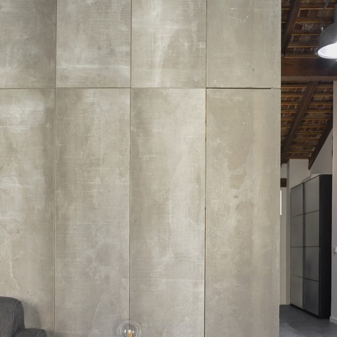 Concerning the materials used, a new floor was laid in such a way that it resembled ceramic carpets. In addition, cement wood panelling was used for the central core. The bathroom, on the other hand, was given a continuous finish.