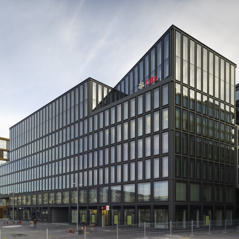 The impact of the building’s façade is due to its sequence of flat, reflective window elements set into a graceful relief of deep shadow recesses. In technical terms, the elemental façade consists of double-glazed, floor-to-ceiling, box-type windows. This style of architecture develops from the detail, while the repetition of glass elements clearly communicates the building’s underlying purpose and identity: in short, the office retains the appearance of an office.
