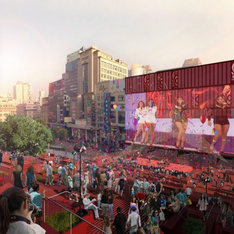 The project offers a different relationship with the public performative activities, engaging with the original function, but also related with a circulation corridor and exposing its seats as a massive inclined plaza towards Nanjing road.