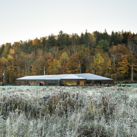The Vallée du Parc Residence sits in a bucolic valley in Mauricie, a south-central region of Québec. Originally inspired by a reinterpretation of the work of American architect Frank Lloyd Wright, the ground-floor plan is shaped by a studied insertion of various terraces and its relation to the automobile. From a distance, the eye is attracted by the complex angular roof that establishes a geometrical reciprocity with the surrounding hills.