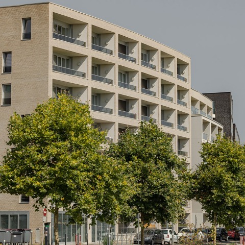The two residential buildings are to the south of the site, with 47 social housing units for rent (building A) and 23 units for sale on the open market (building B). They stand out with their curving facades, which follow the sinuous line of the canal. The project dialogues harmoniously with the existing environment through the careful selection of contemporary materials, such as pale beige bricks, coloured grouting, natural anodised aluminium and glass. Protruding volumes, known as 'spines', are a modern reinterpretation of industrial bay windows and provide each apartment with direct views over the Deûle.