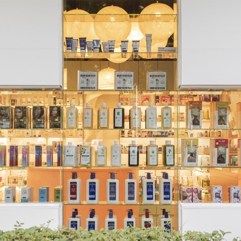 At the same time, the glass shelving in the same opening allows pedestrians walking along the facade to see the products on display.