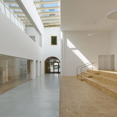Construction of Public Library was an opportunity to expand the program of existing Cultural Centre. A multifunctional space was designed between the new volume of the library and Cultural Centre. It is a place for exhibitions, lectures and a foyer of the existing auditorium.