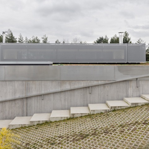 The entrance to the plot is in its western corner, where its highest level is also located. Here the public access road ends, continuing onto the plot as a private driveway. Guest parking is in front of the gate, on the roof of the wine cellar, with direct access to the garden terrace of the house. The entrance and access continue on the plot in the form of a drivable grass ramp and stairs to the residential level of the house. The sloping drive leads to the main entrance, which has covered parking directly accessible from the house. Due to the practical arrangement of the building, the house offers very convenient living. Compositionally, a horizontal form dominates the house, with large windows facing the living terrace and forest. The transition between the terrace and the interior is not linear. In the living hall, a rectangular meander has been created, leading into the house. The living part of the terrace is thus intimately integrated deeper into the center of the building, where it serves as a fully-fledged summer kitchen with outdoor dining and seating. The central living space, with a skylight and its internal and external parts, is crucial for the utilization of the house during increasingly warmer summer periods.