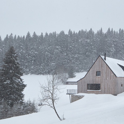 The house is positioned towards the western sloping mountain meadow of the boundary ridge, confirming local customs both in its distance from the road and alignment of the ridge. It echoes the shape of historical mountain houses while incorporating contemporary architectural principles.