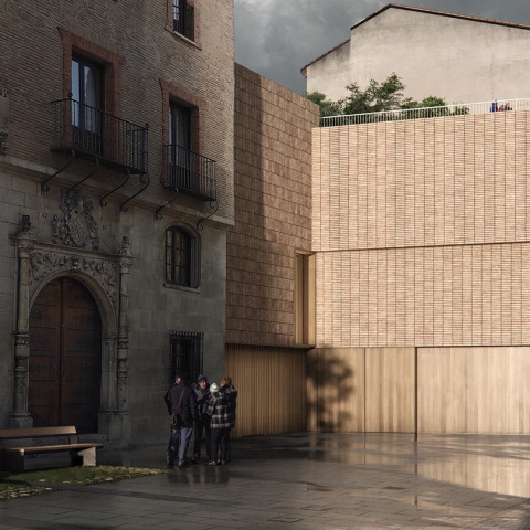 The physical definition of the Archive is expressed as an opaque volume that complements the façade of the Palace. The proposal makes a material link with the urban context through a dialogue with the Cathedral, the activation of the corner and the continuation of Fernán González street.