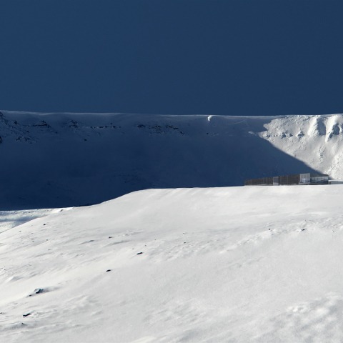 The building designed by Snøhetta is suspended off the ground to prevent heating of permafrost and accumulation of snow. The entrance building is clad with burnt wood and dark glass panels, while the interiors consist of exposed wood elements. Roof areas are designed to accommodate solar panels for harvesting solar energy.