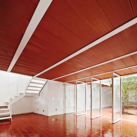 Both the structure and the construction are of an almost overwhelming simplicity. The project unabashedly displays its outward appearance, forming a bold and deliberate contrast with the irregular textures of the boundary walls and the stone, which have been whitewashed. The aim was to create a setting in which the red tones of the ceramic tiles and the deep green leaves of the birch tree inevitably catch the eye, allowing the light that filters through these materials to create the various hues and shades that are cast on the walls and floors throughout the day. The ceramic tiles themselves add the desired texture and richness of colour, thereby doing away with the need for painting or drop ceilings.