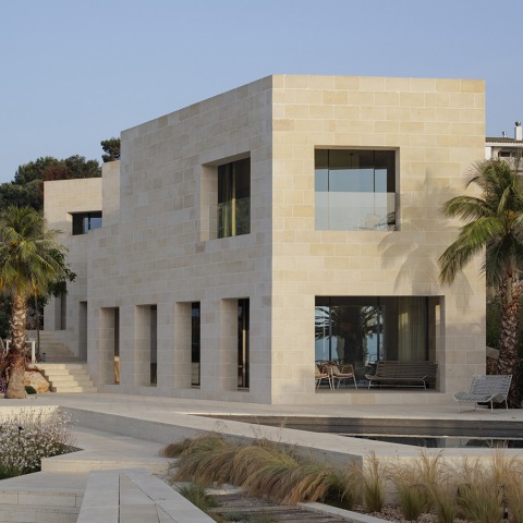 The housing envelope is solid, thick and heavy; abstract and geometric, made with the quintessential local stone, Marés stone, whose tone is replicated in the pavement, gives unity to the construction.