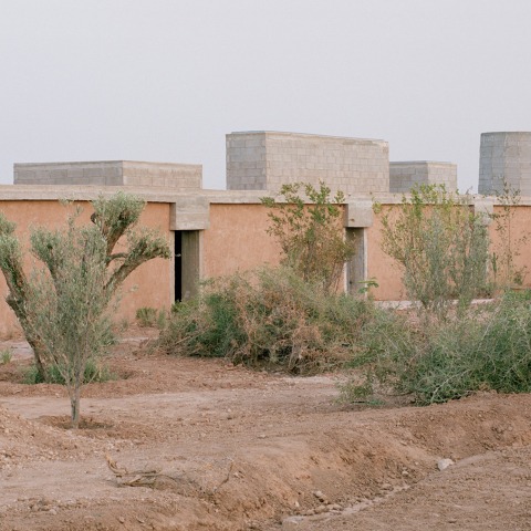 Dar El Farina is a linear rural house following the two lines of the mesref and the khetara. The house divides the land into two radically different landscapes. On one side the desertic land is kept untouched ; on the other side a lush green garden of indigenous plants grows thanks to the ancestral water systems. The off-grid house uses the sun, the soil and the water available onsite to be fully self-sustainable.