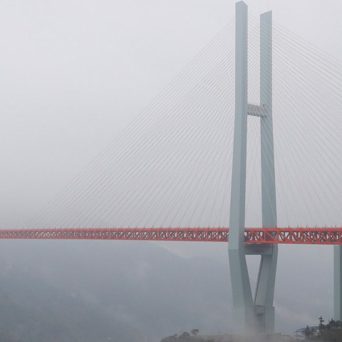 The bridge crosses directly above the Beipanjiang valley and this new route connects the cities of Xuanwei, in Yunnan Province, and Shuicheng, to Guizhou, in about an hour's drive from more than four before.