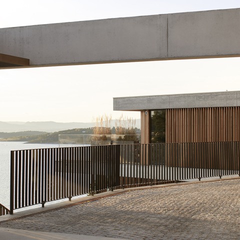 The complex is built with load-bearing walls that seem to emerge from the mountain, executed with stone and concrete. As the house grows to the horizon, its structure marks the flight of the horizontal slabs and roofs, lightening vertically with slender cross-shaped steel pillars, arranged to form 3.15m x 4.30m bays. The rest of the materials that dialogue with the structure are cedar wood and glass.