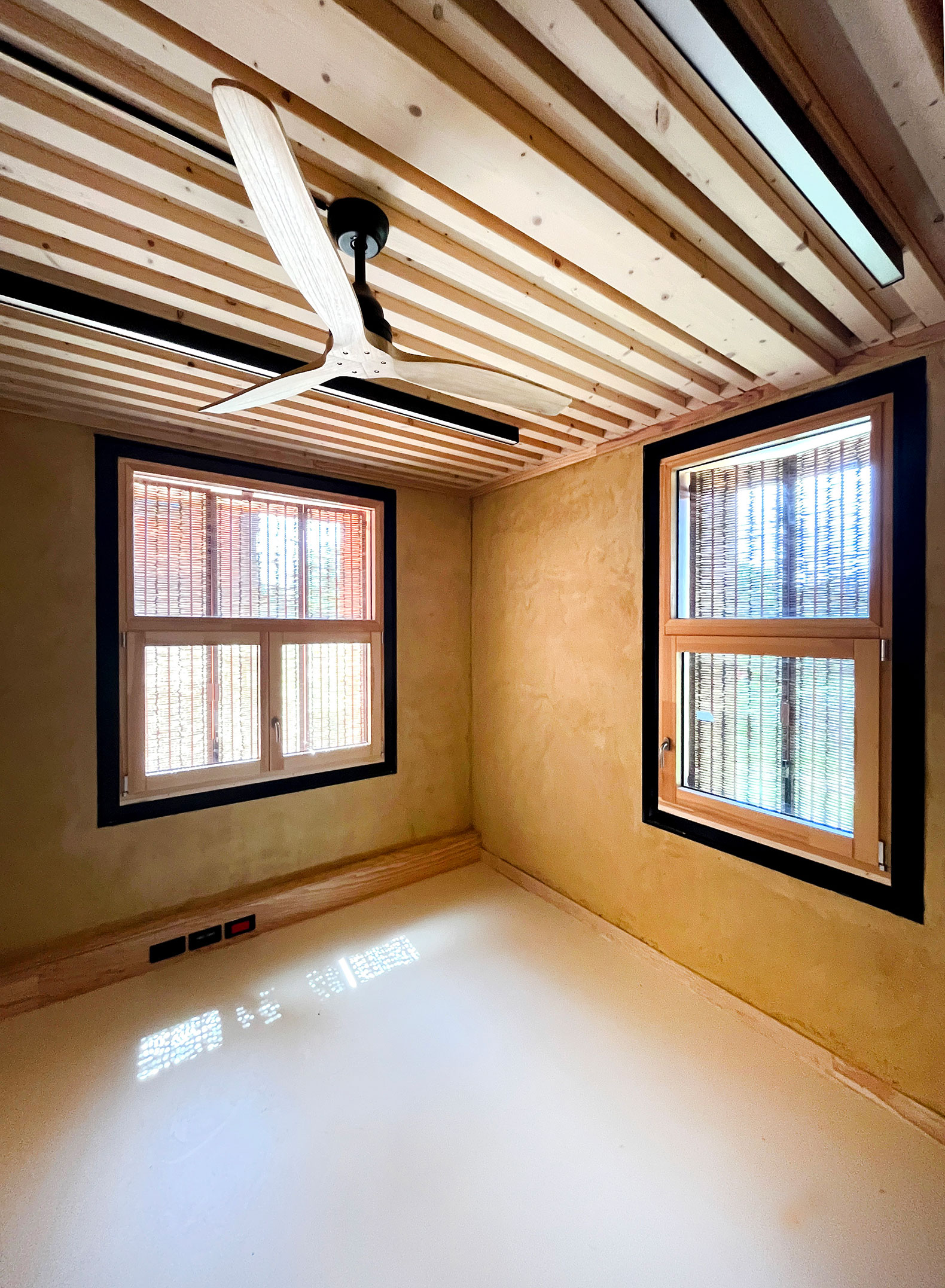 Comfort in summer is ensured without air-conditioning thanks to a combination of passive systems: natural ventilation by means of thermal draught thanks to skylights and a fan, thermal inertia enabled by the interior earthen plasters and a mud brick mashrabiya favouring a cooler interior microclimate. The design also incorporates efficient external sunshades thanks to a peripheral awning, external Venetian blinds and woven wickerwork shutters.