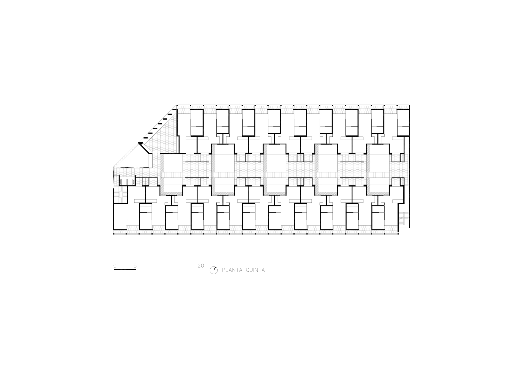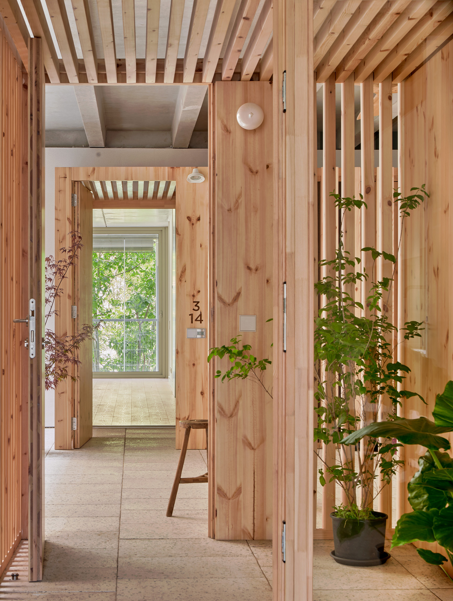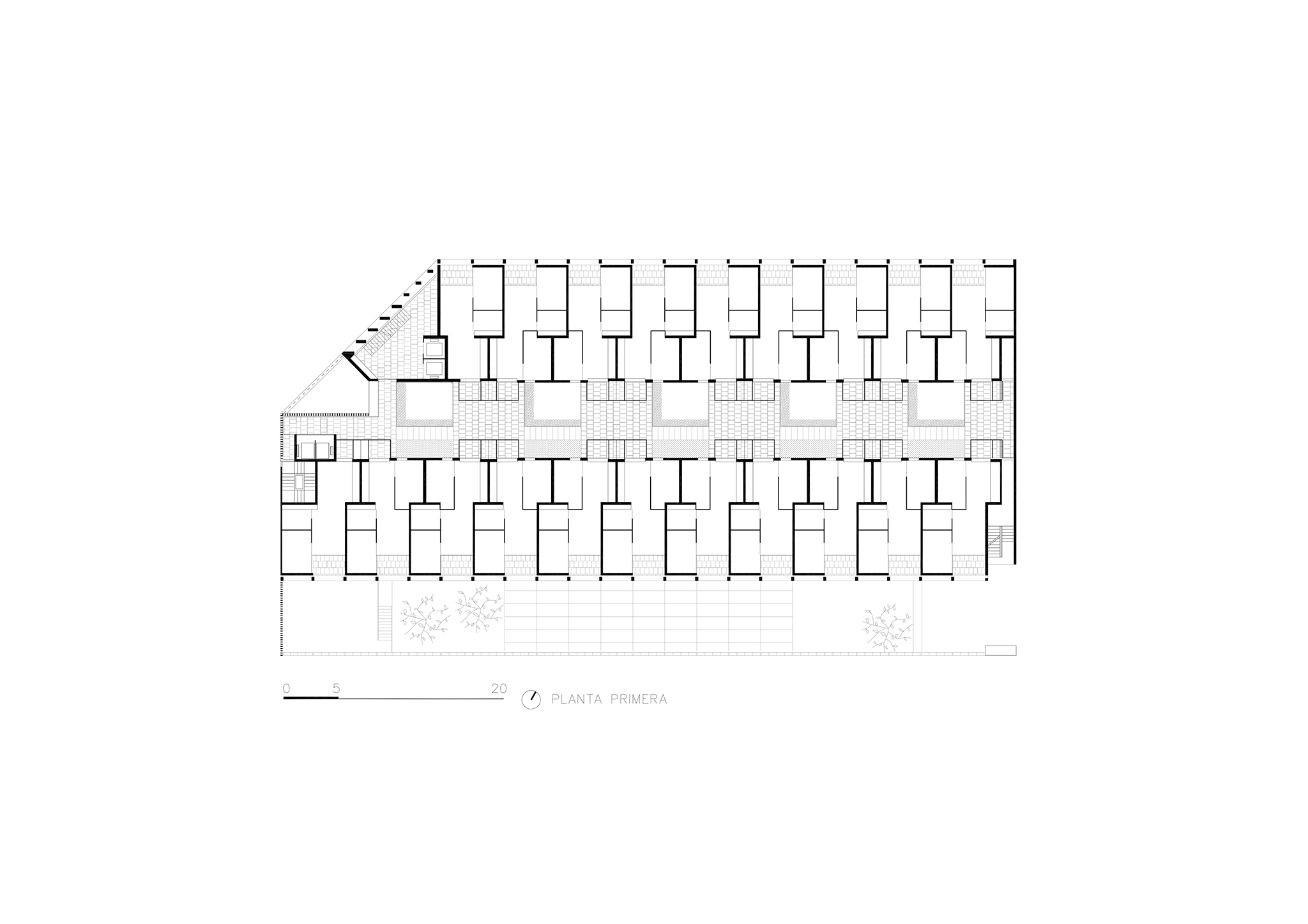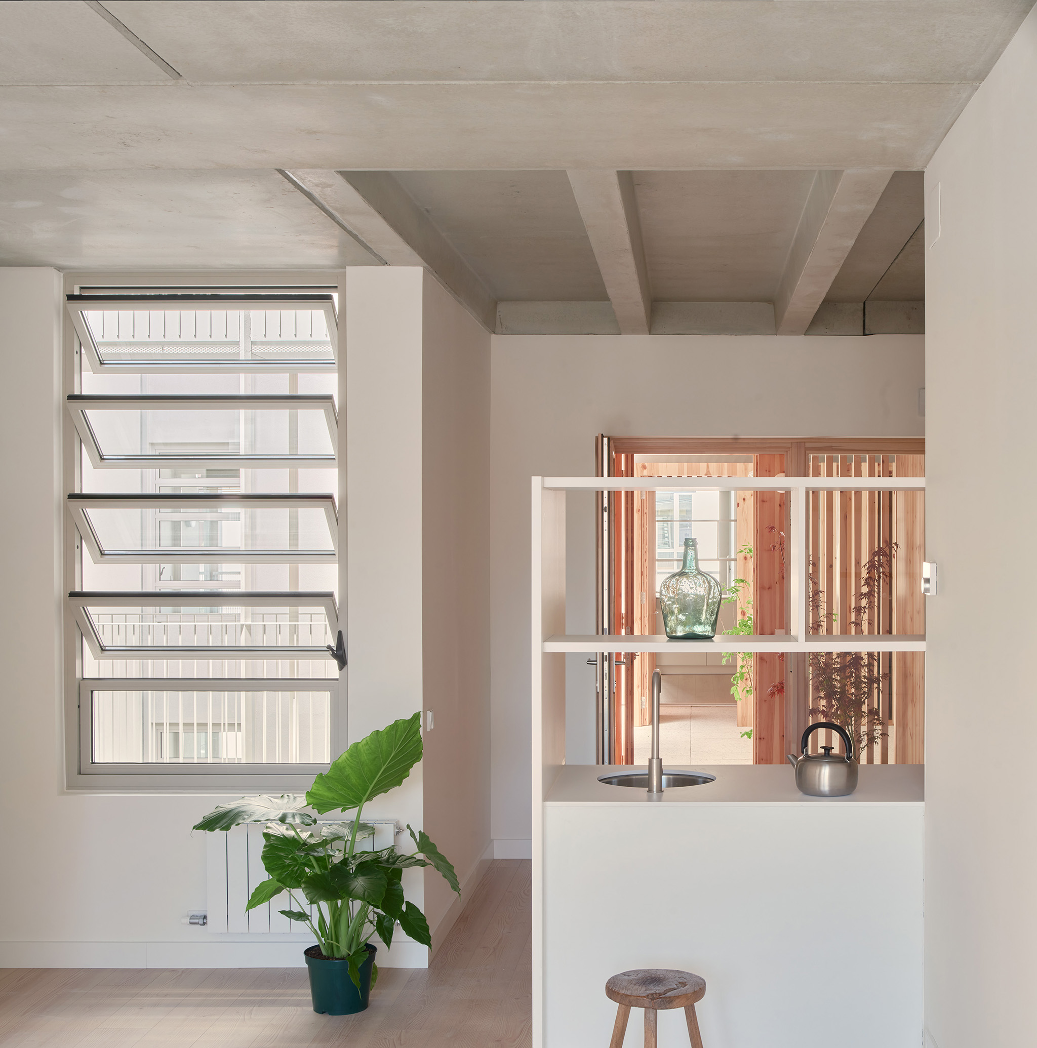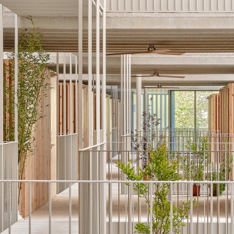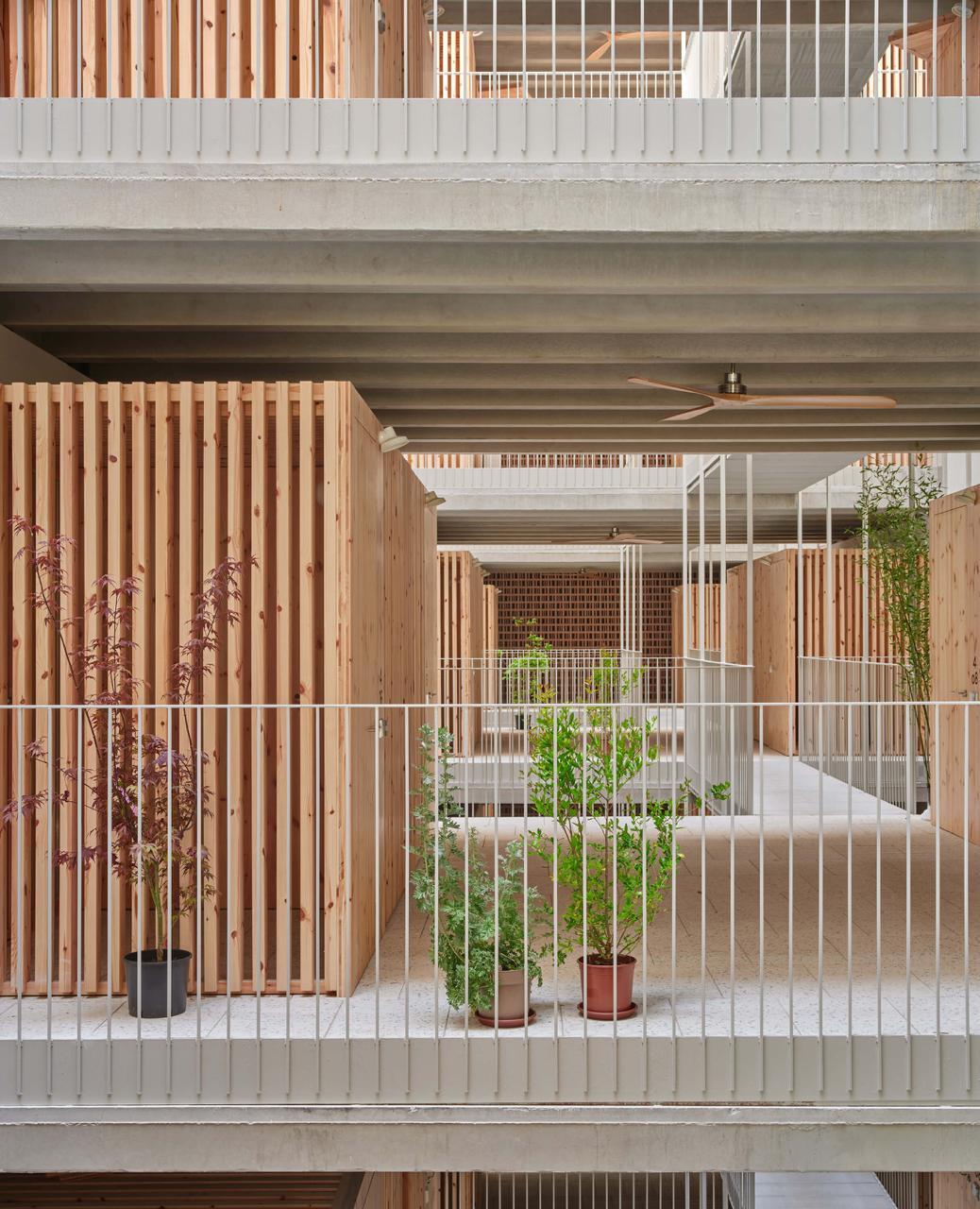 The floor plan is laid out with 20 homes per floor, arranged around a walkway that functions as a raised access, crossing a sequence of five courtyards and entrance landings. Each landing has four entranceways, formalized by wooden latticework structures that filter views and air, regulating privacy and encouraging occupants to appropriate the space. Each home is organized by two diagonal spaces—connecting a kitchen-diner with the entrance, and the living room with the terrace—that lead directly to the bedrooms to avoid the need for corridors.