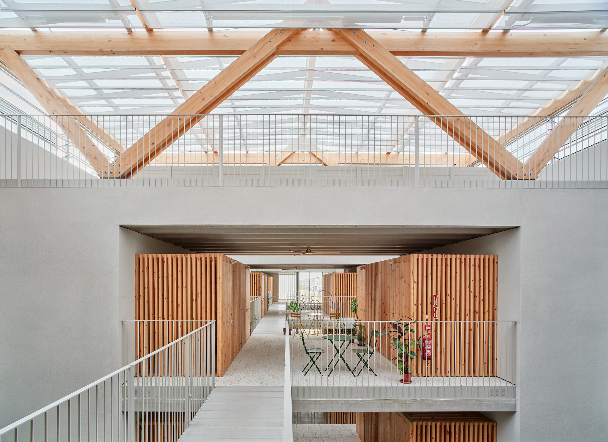 Floor eight houses the shared facilities of the homes for seniors, including a community laundry, clotheslines, solarium, urban allotments and multipurpose spaces. Above, a great glass roof envelops the five courtyards, transforming them into a bioclimatic atrium that varies in function according to the season: a heat collector in winter and a thermal chimney in summer. This creation of space within the building is an environmental strategy that passively reduces energy demand, at the same time acting as a social condenser.