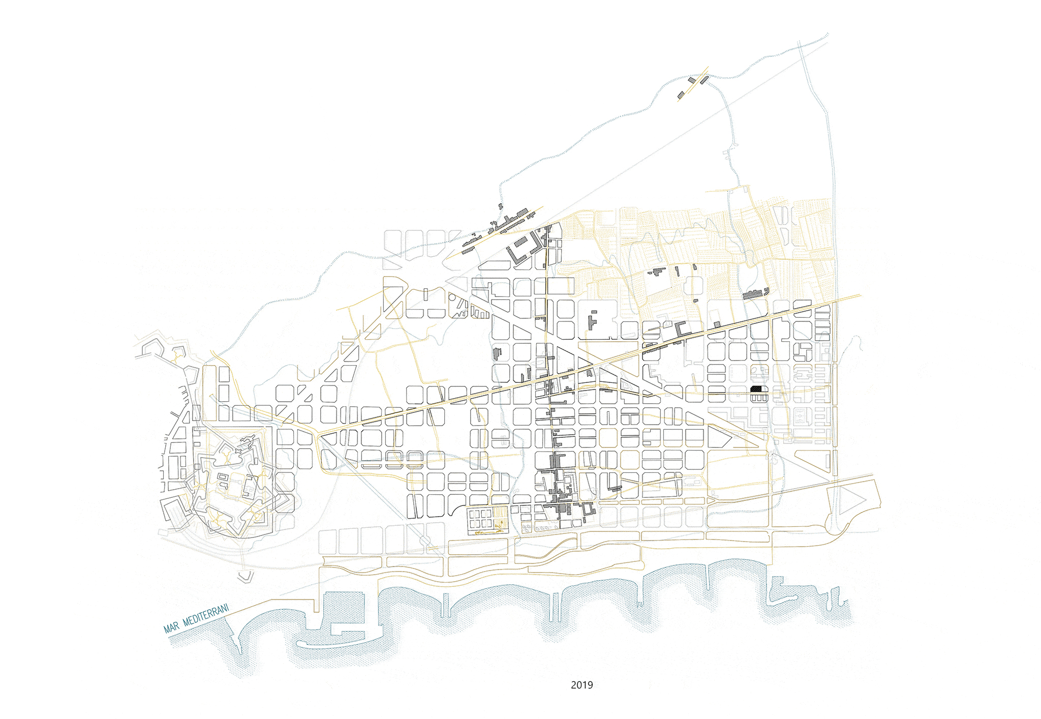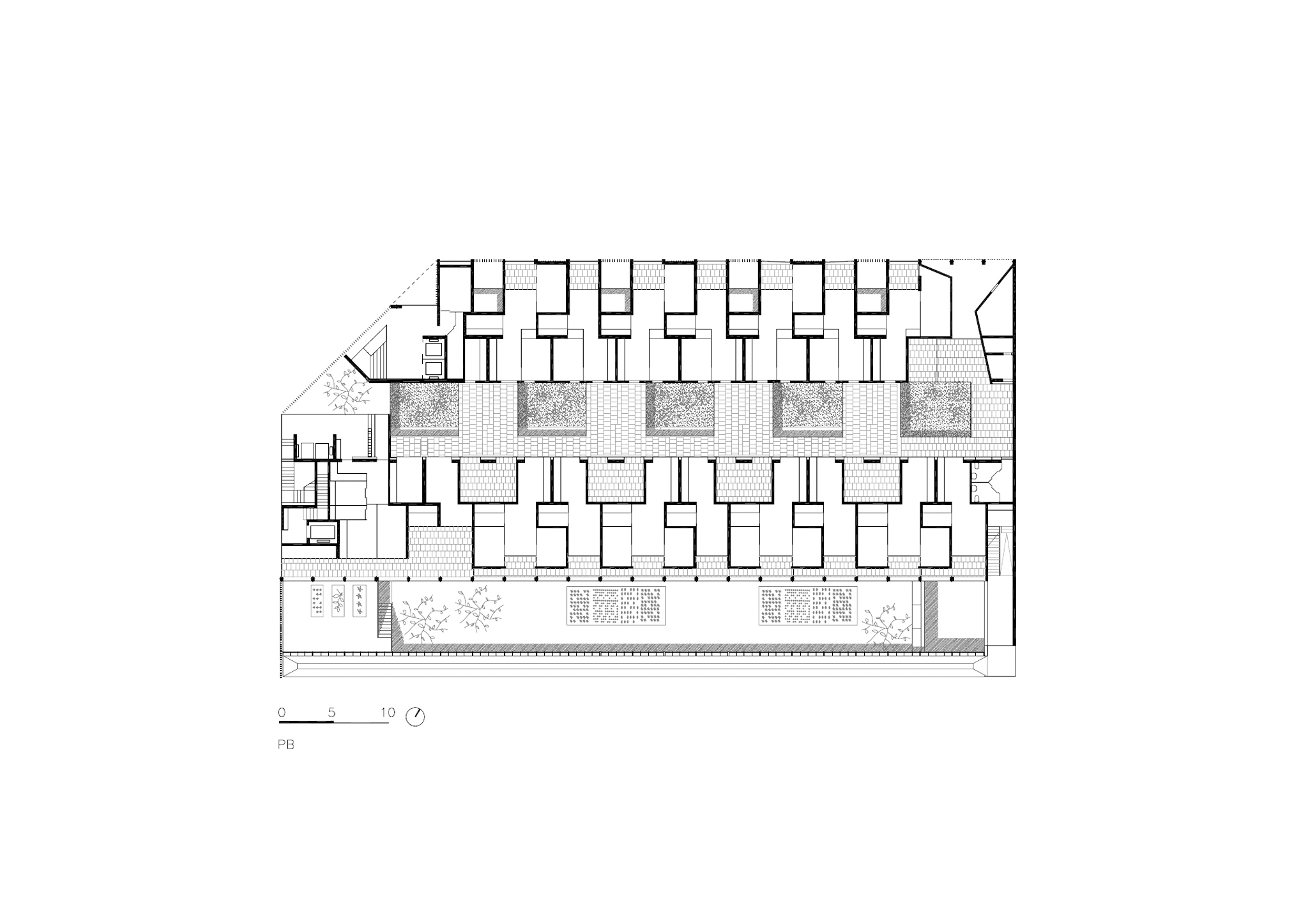 The building is set in the urban fabric of the 22@ district, covering the party wall and following the layout of Cerdà’s Eixample grid along the street, the chamfered corner and the passageway. The buildable depth of the plot and the height stipulated by urban planning (eight floors) require the creation of space inside in the form of courtyards to light and ventilate the various housing programmes that coexist independently in the building.