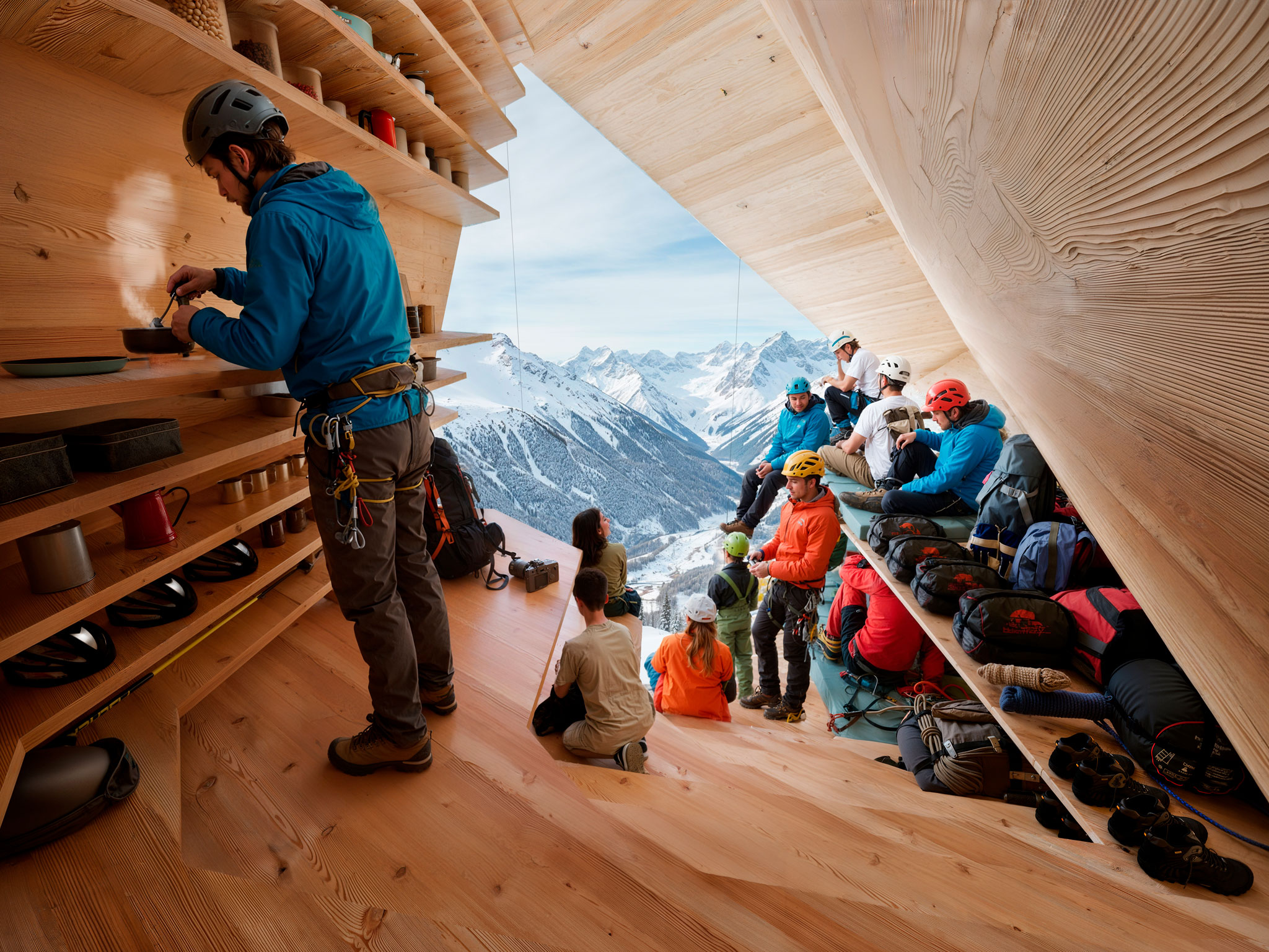 CRA’s approach to the design seeks to dissolve the boundary between nature and human-made structures. By digitally scanning alpine rock formations, the team created a precise 3D model of the landscape, which informed the shelter’s design. The result is a shell structure made of cross-laminated timber (CLT), aerogel, and metal that is inspired by the crystalline formations of the Alps and blends with the shape of its surroundings.