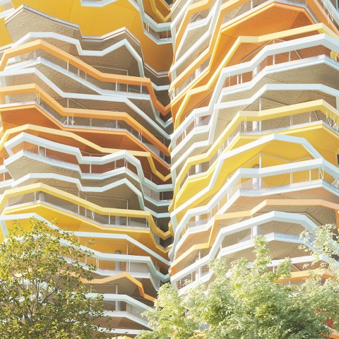 The volume of the tower has been designed based on a collection of planes and horizontal lines of different color tones, which create a sensation of lightness and stylize the mass of the building. All planes are covered with different textures of wood, giving the new tower a natural and pleasant image. The edges of the slabs, the handrails and the parasols are painted in yellows, oranges and light greens, completing the chromatism of the façades. This range of colors has been used in line with the climate and atmosphere of the city, in line with the surrounding landscapes, in line with the skies.