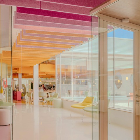 The architects have carefully chosen the materials and color palette used to respond to demands for sustainability and well-being. On the one hand, each construction element was selected with minimal environmental impact in mind. On the other hand, the vibrant colors that characterize the interior seek to positively influence mood and work dynamics. These offices challenge the paradigms of the workplace, blending programmatic innovation, sustainability, and comfort.