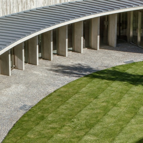 The project proposes an ascending volumetry resulting from the intersection of an inclined plane with the resulting shape of the floor plan (traces of ellipses and circular arcs). In this way, the spaces closest to the entrance (kitchen-cellar and classroom for 100 people) enjoy greater height and enhance the image projected to the outside of the complex. It is in the courtyard that this volumetry takes on a greater significance, acquiring an ascending sense, like a snail's shell, accessed through a unique entrance, a wave of petrified concrete that acts as a landmark and attraction for the visitor, a cave through which the garden of the pavilion can be glimpsed.
