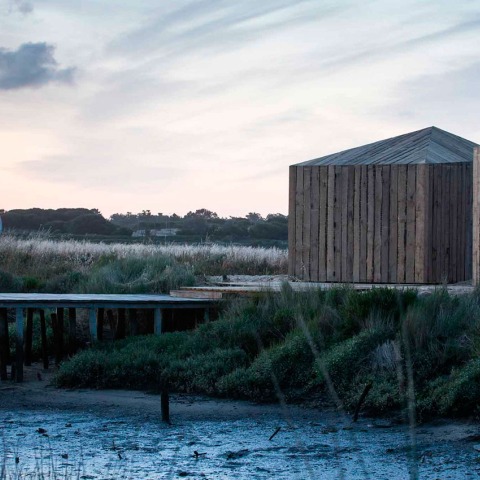 The wharf is medieval and assembled with wood. Its identity is kept long beyond the material’s resistance. An identity that allows to change, to replace, keeping all the values. The project develops two spaces: one to unwind with the support of a kitchen integrated in the same material of the walls; other as a sleeping area with a small bathroom and a shower. The construction is entirely finished in reused wood, subjected to the weather that will keep on changing it. The forms, highly archetypal, are designed by the incorporation of the functions in these minute areas, and by the varied inclination of the ceilings that tension the spaces according to their function.