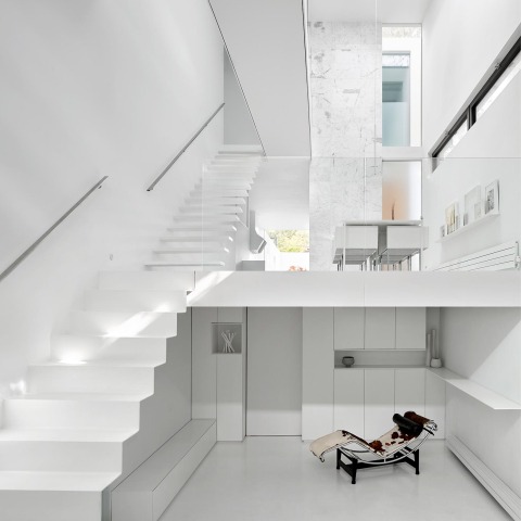This includes the expansion and compression of single, double and triple height spaces, and through one’s engagement of interior elements such as bridges and stairs. The house is configured to capture the ever-changing light and shadow effects in various areas of the residence. The shadows cast in the interior reveal the juxtaposition between the permanence of the architecture and the ephemeral of the natural.