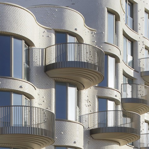 Shoreline’s flowing curved form echoes the shape of the waves, pebbles and coast. The facade’s white glazed bricks reflecting the changing colours of the sea and sky according to the weather and the time of day. The unique, contemporary design is created with materials and robust details required for the seafront exposure. The white glazed bricks, sourced from Spain, refer back to the white stucco Regency houses at the top of the Leas. The crafted facade acts as a "hard shell," with all external elements being of the highest specification possible to endure in a marine environment. The bricks were carefully crafted and cut to help curve the gentle contours of the buildings. Over 28 designed brick specials have been utilised. The result is a glistening facade that reflects the sun and sea in sync with local weather patterns. A playful interpretation of the clinker brick sits within the concave rhythms of the south facade, where individual-shaped bricks are pulled forward to create interest and animation.