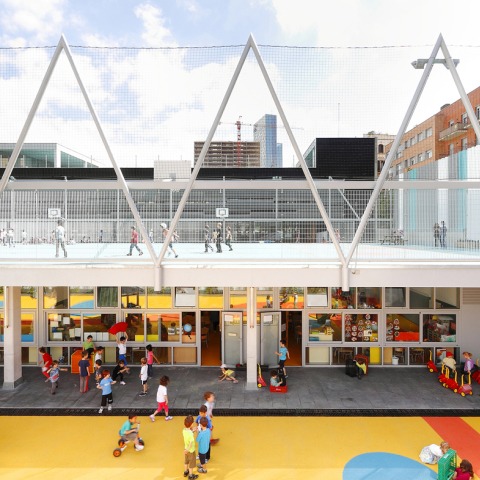 The building is situated in highly dense surroundings where Cerdà's Eixample merges with the Poblenou industrial layout. The dense and complex program (indoor and outdoor), the dimension of the plot, the rigid urban planning rules and the unmodifiable underground position of the car-park, forced a re-think of the standard directives of public schools and how to adapt St.Marti’s to this specific location. The bulk program of the school is located on the ground floor and all the rooves become school’s playgrounds. The proposal alternates with equal importance the voids and constructed areas. Consequently, better use of natural light, ventilation and views over the inner school spaces are made possible.