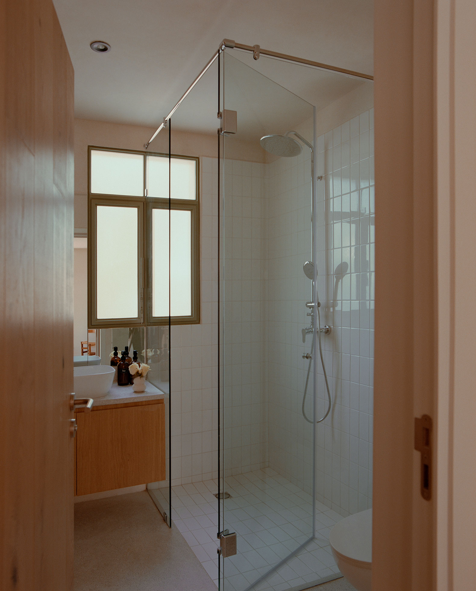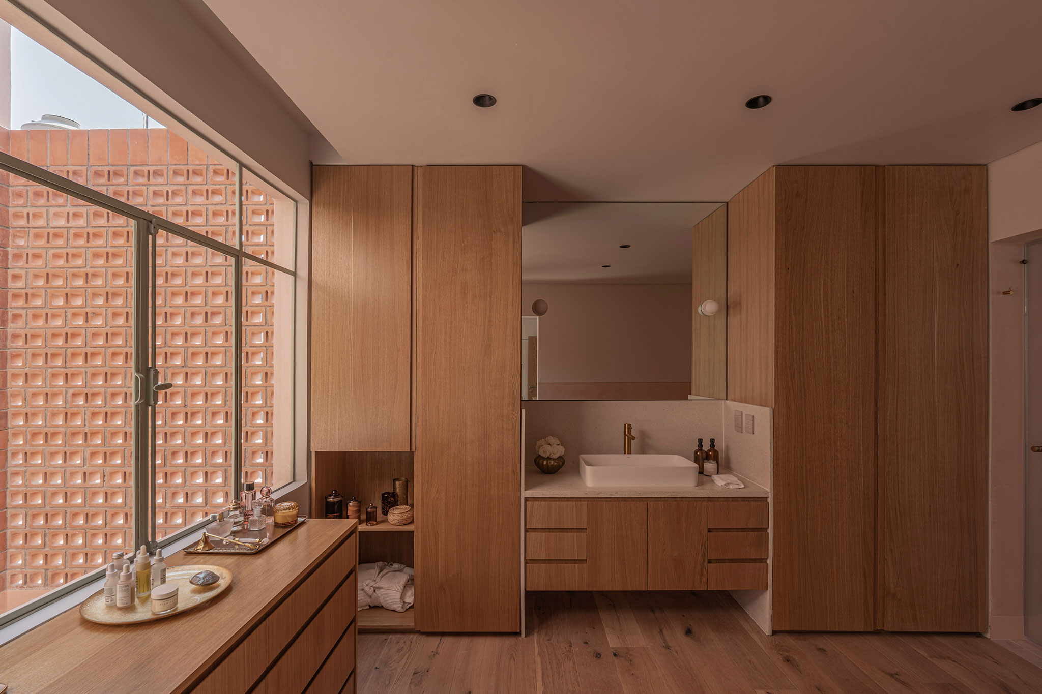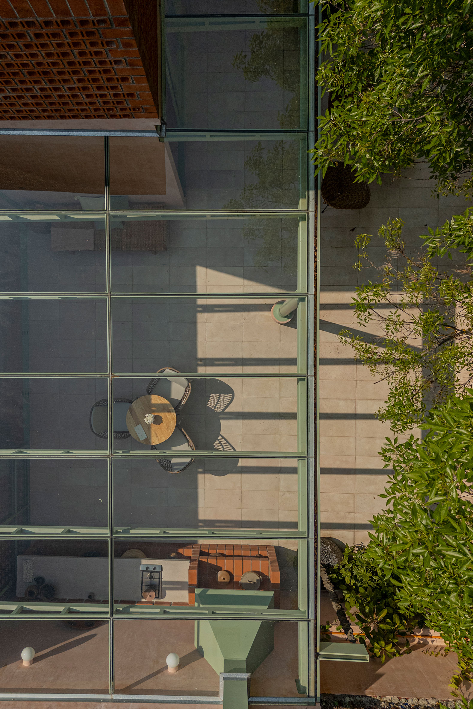 The original north–south orientation resulted in interiors predominantly lit by indirect light. The architectural strategy introduced new openings, expanded visual connections, and incorporated brick lattice screens to allow east–west light to traverse the volume. The house shifts throughout the day: soft mornings, lateral brightness at noon, and warm reflections in the afternoon.