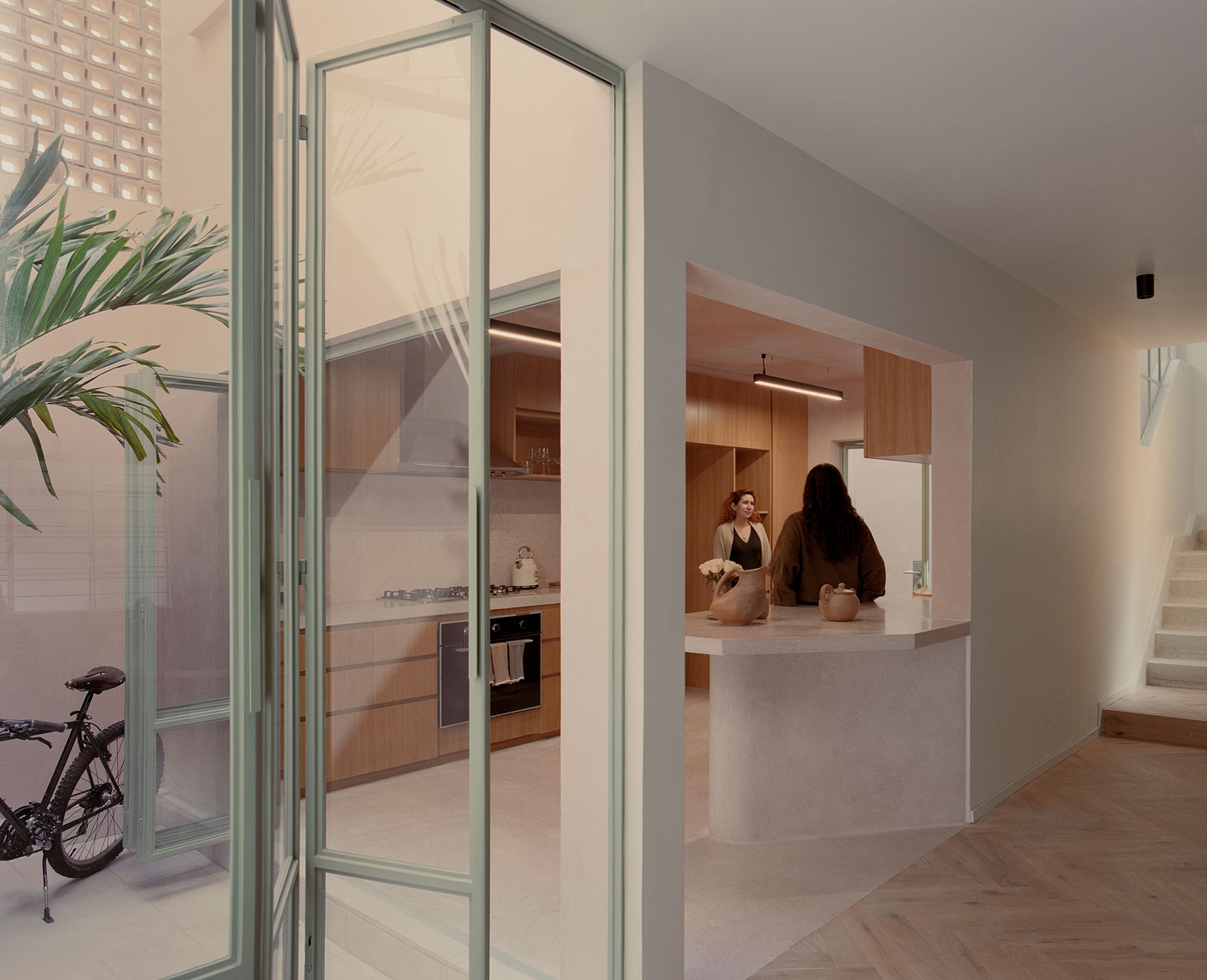 The living room, dining room, and kitchen unfold as an open sequence toward the patios, enabling cross ventilation and visual depth. The kitchen, finished in cast-in-place terrazzo, functions as the spatial core of the level and as a connector between interior and exterior.