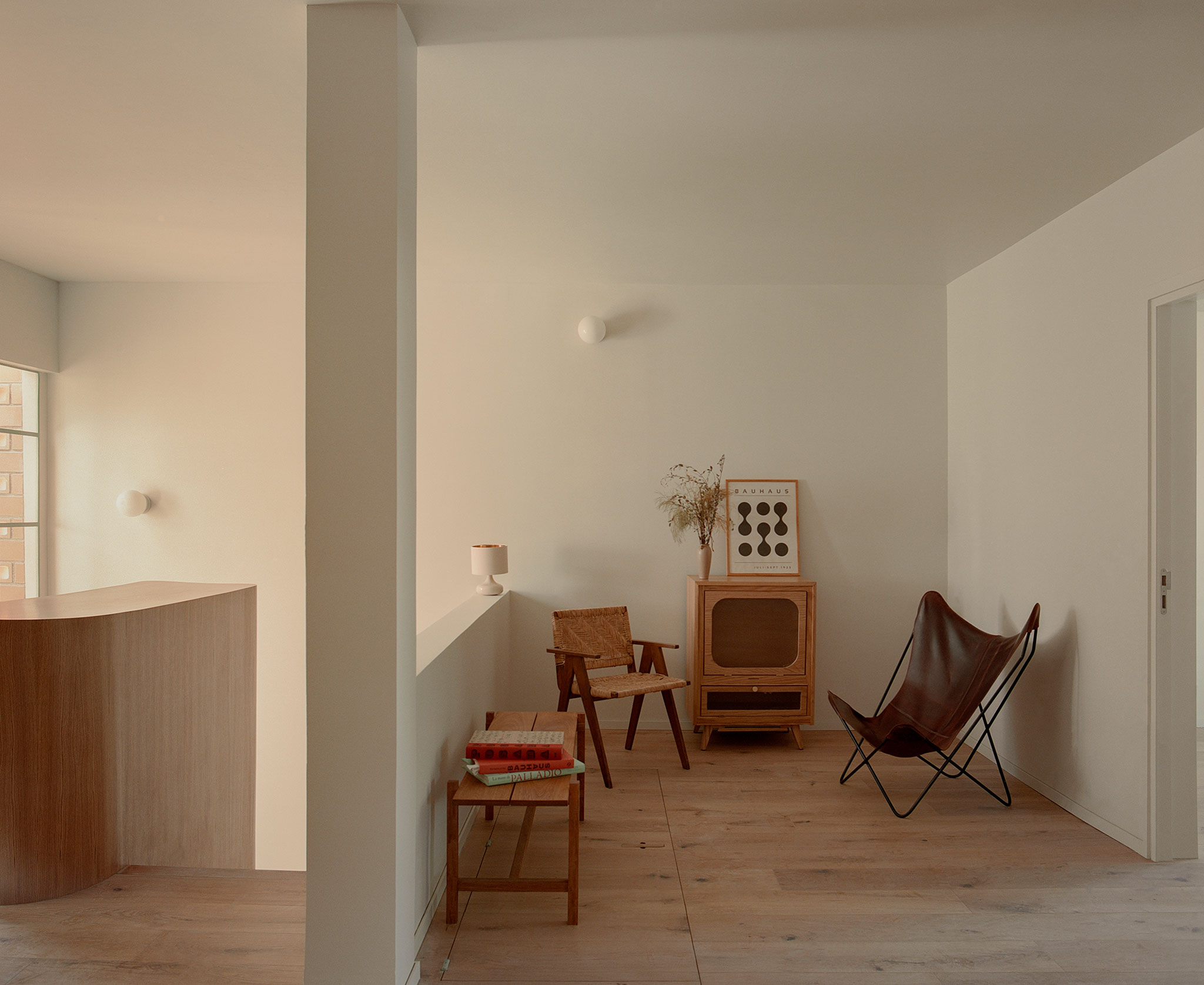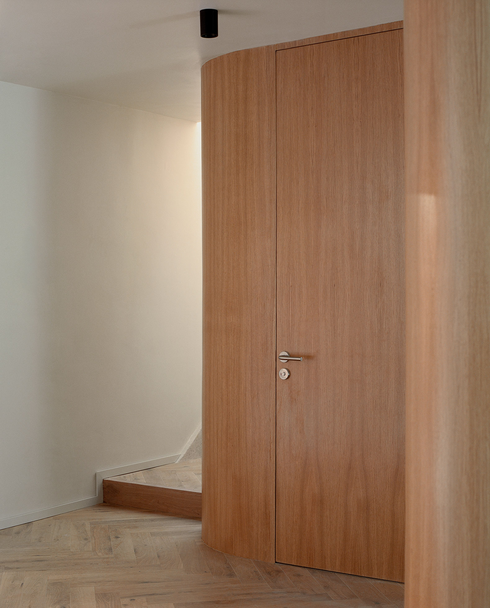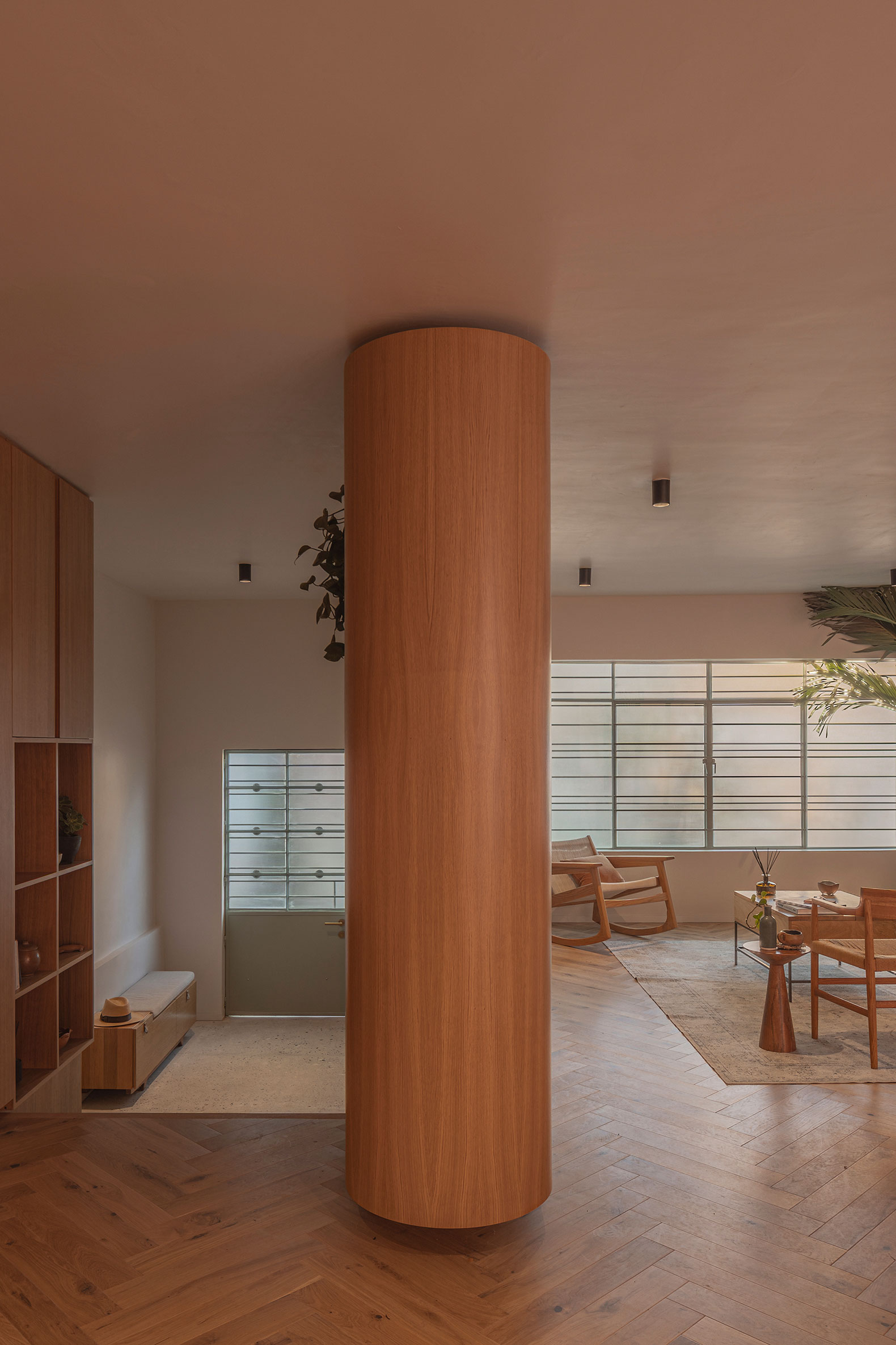 On the ground floor, one of the key gestures was the reconfiguration of the entrance to restore privacy and transition between the street and the interior. A custom-designed millwork system integrates storage while acting as a vestibular device: a continuous wooden element organizes arrival, filters direct views, and establishes a clear threshold before entering the social areas. This piece articulates living room, dining area, and circulation, providing order and containment without additional walls.