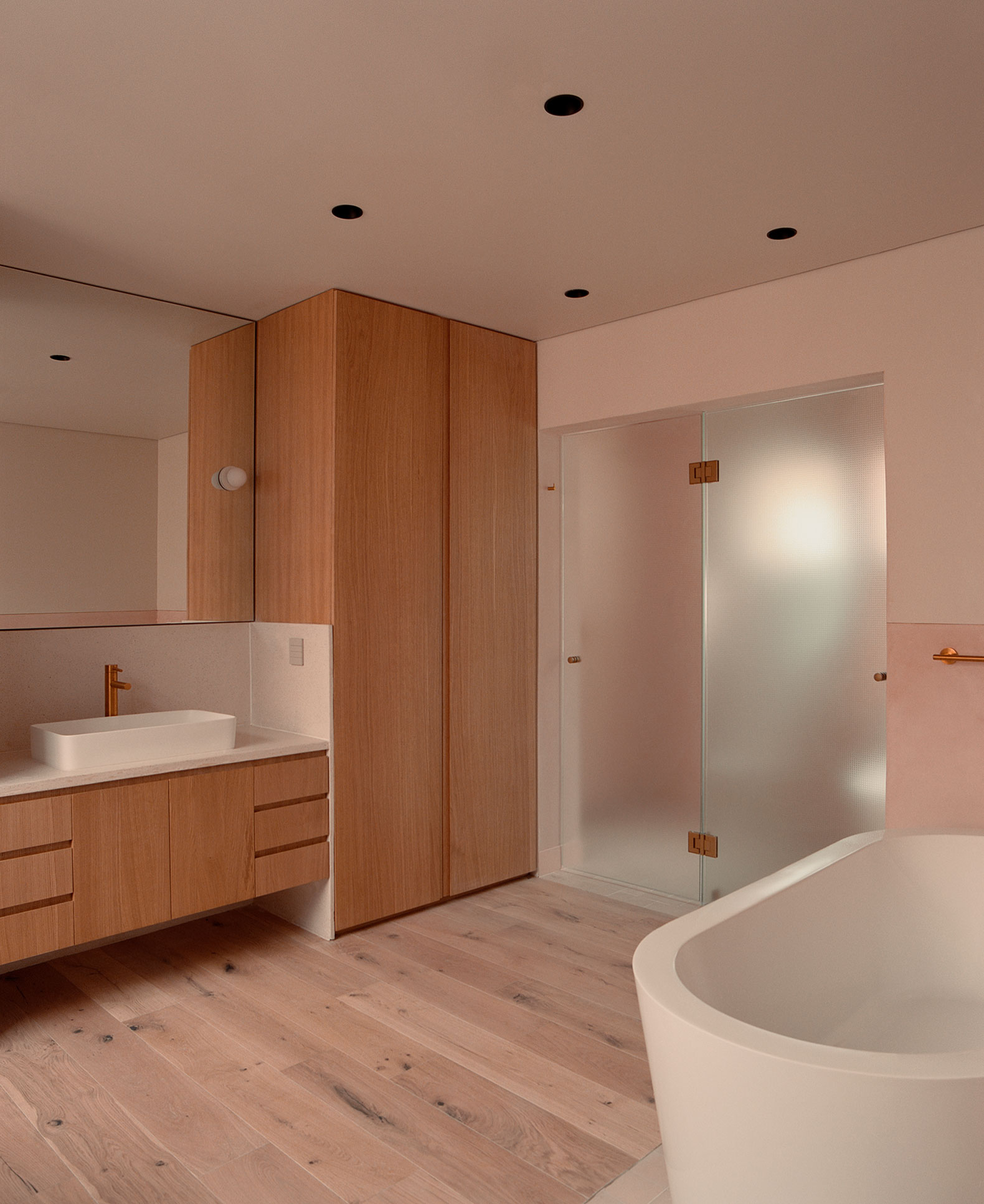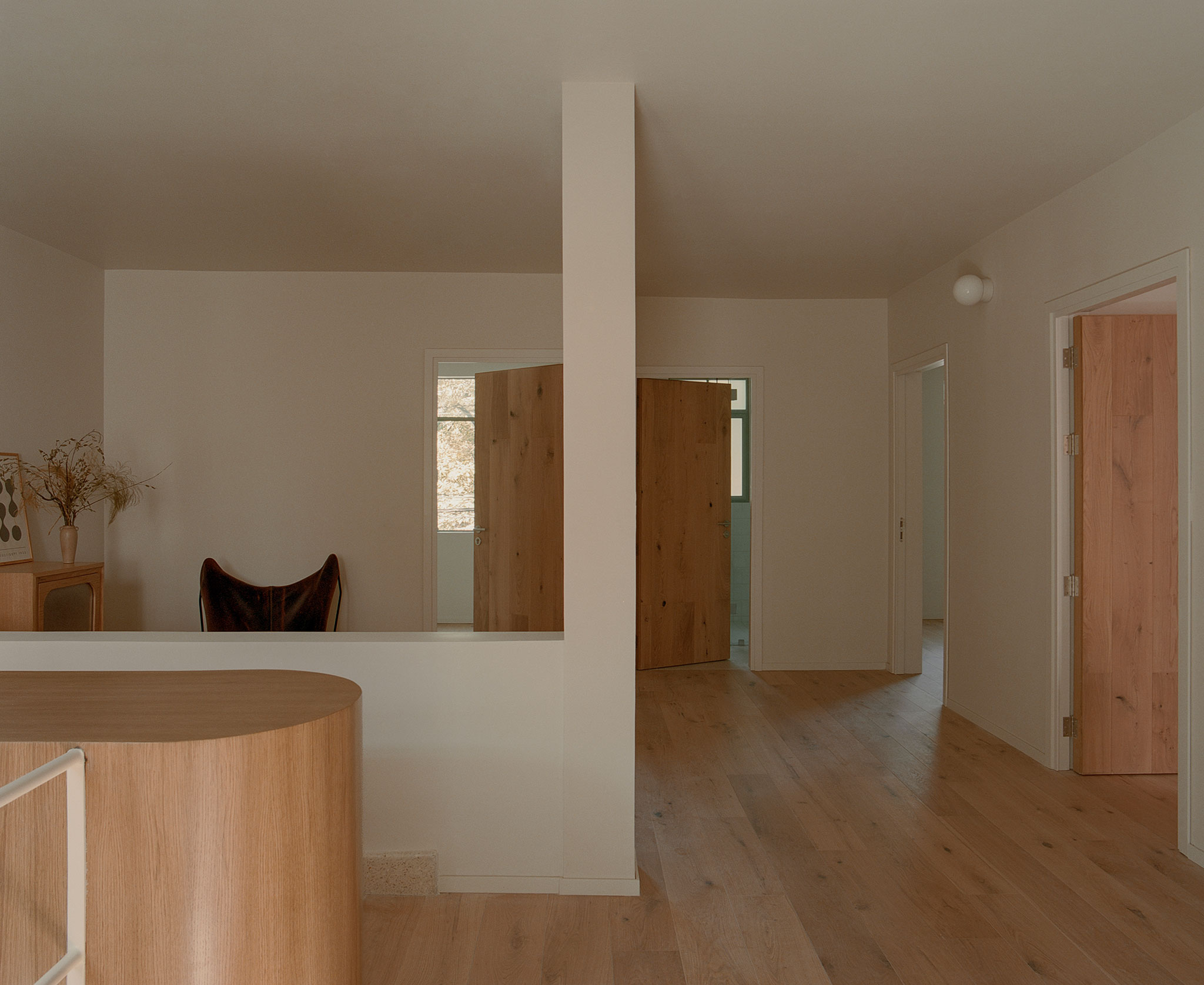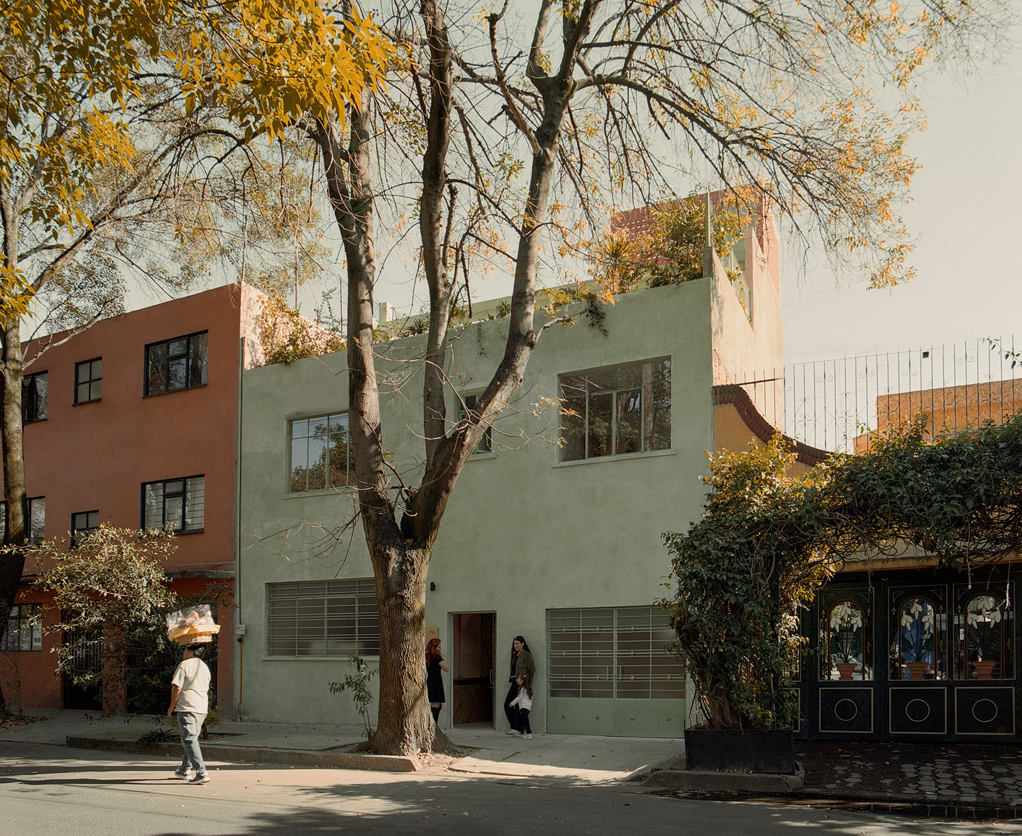 The soft pink tone was selected for its luminous qualities in a temperate climate and its dialogue with the neighborhood’s vegetation. Its warmth contrasts with the green chosen for the original ironwork—carefully restored and complemented with new custom pieces—producing chromatic variations throughout the day. As light shifts, the surfaces change, anchoring the house to its specific environment and avoiding a generic image.
