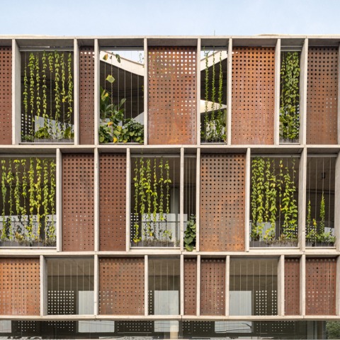 The project uses materials selected to adapt to local conditions, reducing the need for frequent maintenance. The construction uses prefabricated concrete pieces, corten steel panels and extensive vertical vegetation, which takes center stage on the façades.
