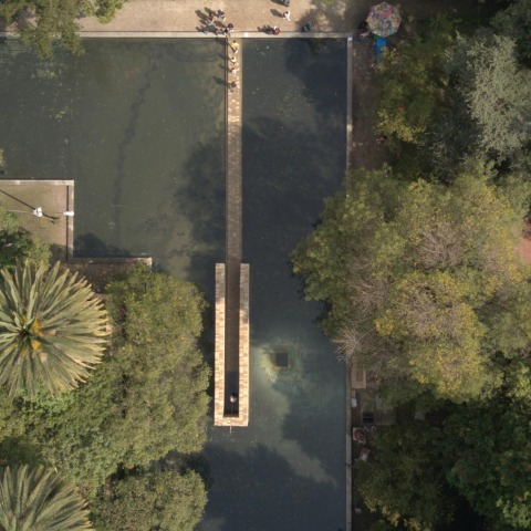 Built as a linear shape on the pond, through a path on water, also made with the same type of blocks, it ends up enclosed between three walls that show at the bottom what looks like a large rock floating in the air.