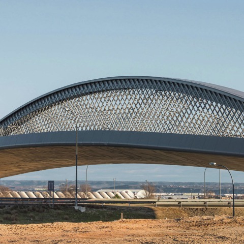 The competition proposed a “singular” bridge, as an entrance to Madrid from T4 and the new neighborhood of Valdebebas, which was responsible for its financing. This iconic character was proposed to be obtained with an object that was resounding in its formal limits, and with a curved geometry that generated a soft, warm, and heavy organoleptic reading, like a burnished tool.