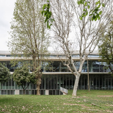 The Library is located in a privileged site, an urban park in Cordoba on the border of a wide avenue that covers the railway network. It builds up the continuity with the garden visually linked to the large trees and on its opposite side, the main façade is a continuous and precise lattice facing the city, building the park's limit with the avenue. This three-dimensional aluminium lattice screen unifies views and lights and lends a serene and abstract image to the avenue. The trapezoidal plan adapts to the historic layout of the 18th century Agriculture Gardens, respecting the existing trees unfolding its height from the traffic road to the park. The pavilion image of the Library towards the park is lightened by a balcony that extends the reading spaces to the garden between the tops of the trees and thus introduces the vision of the green landscape inside.