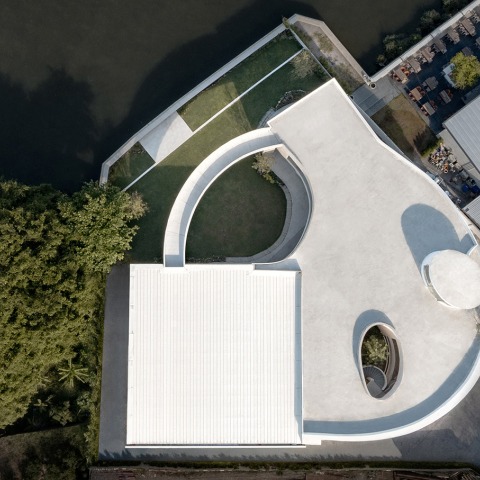 As a reception space for guests, the ASWA project incorporates an imposing main entrance that connects to a welcoming, enclosed oval courtyard, bathed in natural light that filters in and creates a calm and inspiring atmosphere. A series of interior spaces connect with the courtyards and the unique setting of the Chao Phraya River, making it possible to hold ceremonies in a unique location in Bangkok.