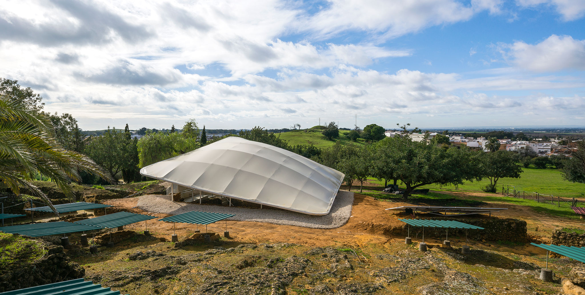 The canopy is truly a machine that integrates an active protection system (based on ventilation and air extraction elements) to maintain the hygrothermal conditions of the tombs at optimal values for their conservation. In the air chamber created between the two membrane layers that make up the canopy, an effective site protection system is integrated, consisting of:
