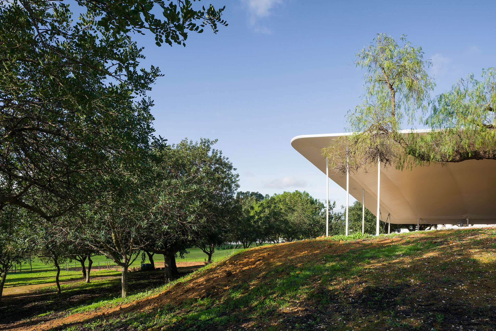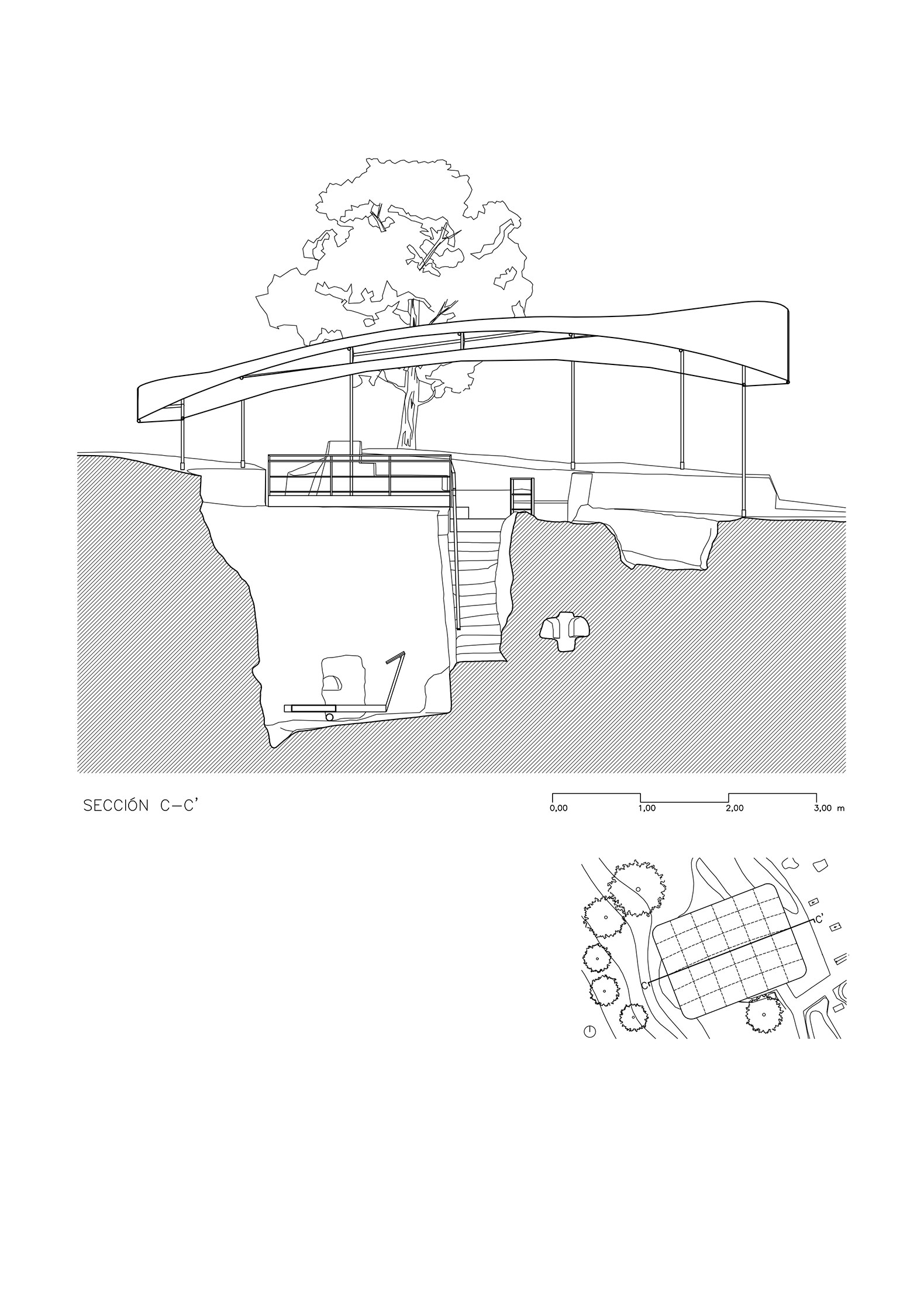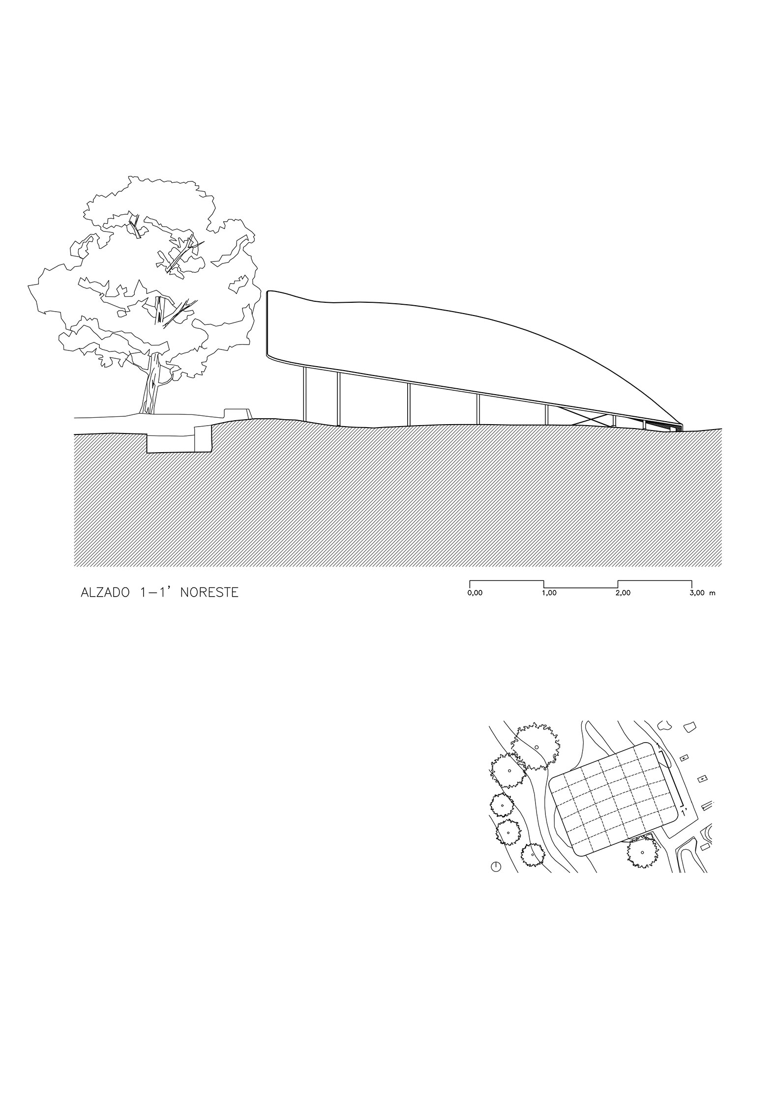 -The effect of the supports has been minimized, promoting the idea of free space and, in any case, integration into the natural environment of the site. Thus, the supports touch the ground with the least possible material, making it evident that the canopy is an independent entity rising from the terrain.