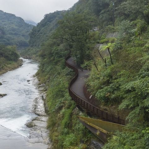 The design of the Dark Line, very precise and adapted to the topography, refers not only to the art of the Japanese engineers of the early 20th century who designed the original work but also to that of the first engineers of ponts et chaussées (bridges and roads) in 18th century France, whose cartographic activity served to adapt the necessary geometric rationality of the infrastructure to the irregularities of the site. This dialogue is particularly virtuous in the design of the 170-meter-long footbridge, which extends the route where the bridge is missing, branching out and clinging to the cliff to connect the route to the Yuliao road, which is higher up. This solution is also reminiscent of the "Chemins volants" (flying paths) recommended in Henri Gautier's treatise on road construction at the end of the 17th century when the slopes were so steep that it was necessary to devise structures embedded in the "rock itself" 3.
