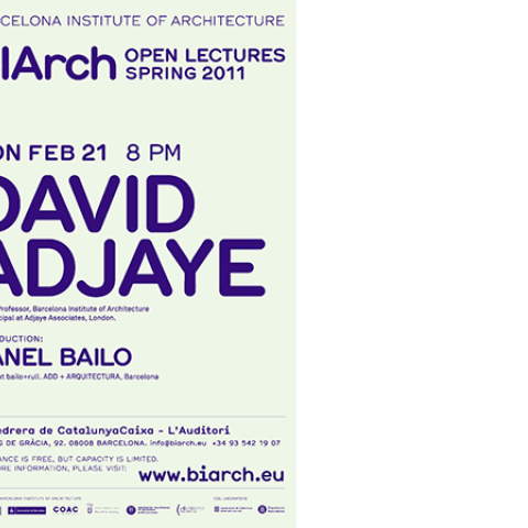 The Barcelona Institute of Architecture present the first BIArch Open Lecture of the Spring 2011 term. The lecture, "Themes and Works", will be delivered by David Adjaye, Visiting Professor at the Barcelona Institute of Architecture and founder and principal of Adjaye Associates, London. David Adjaye will be presented by Manel Bailo, founding partner of bailo+rull | ADD + ARQUITECTURA, Barcelona.