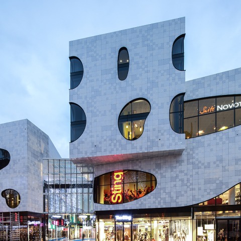 De Passage (formerly Nieuwe Haagse Passage), designed by Bernard Tschumi Architects, is a new commercial building built around an interior passage that connects to the 19th-century passage at the north end and the busy Grotemarkstraat at the south. The complex contains a 200- room hotel and retail shopping on two levels in a 17,500-square-meter complex. The building’s distinctive blue and white tiles and free-form fenestration mediates between old and new in the historic city.
