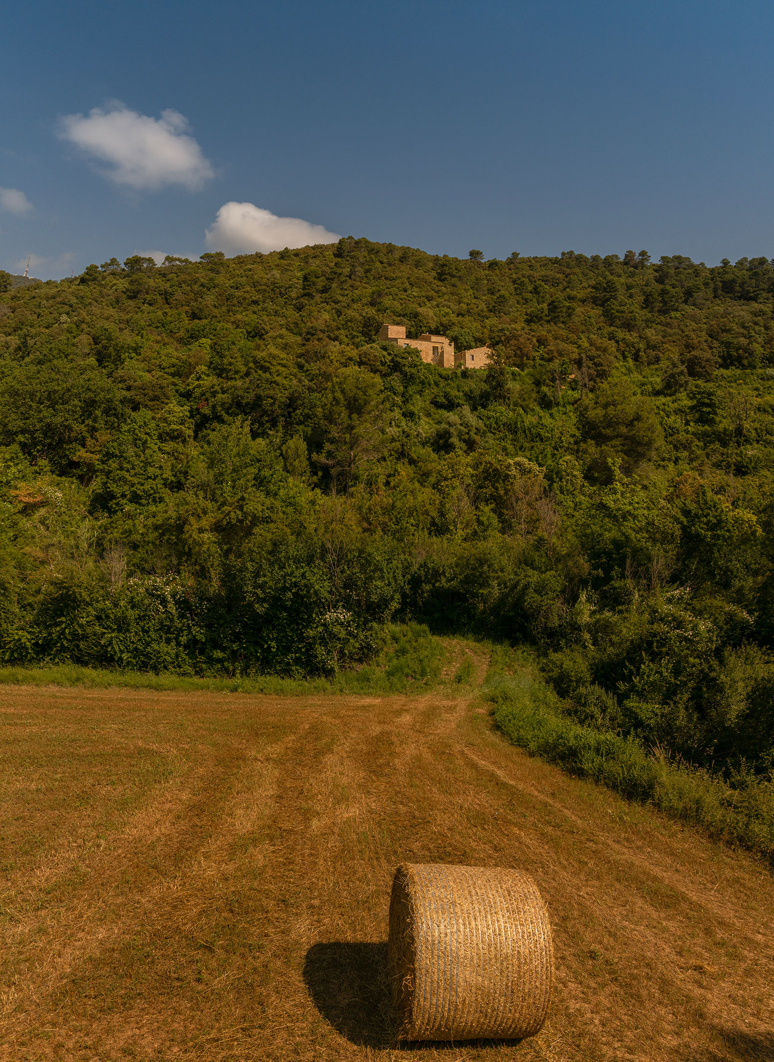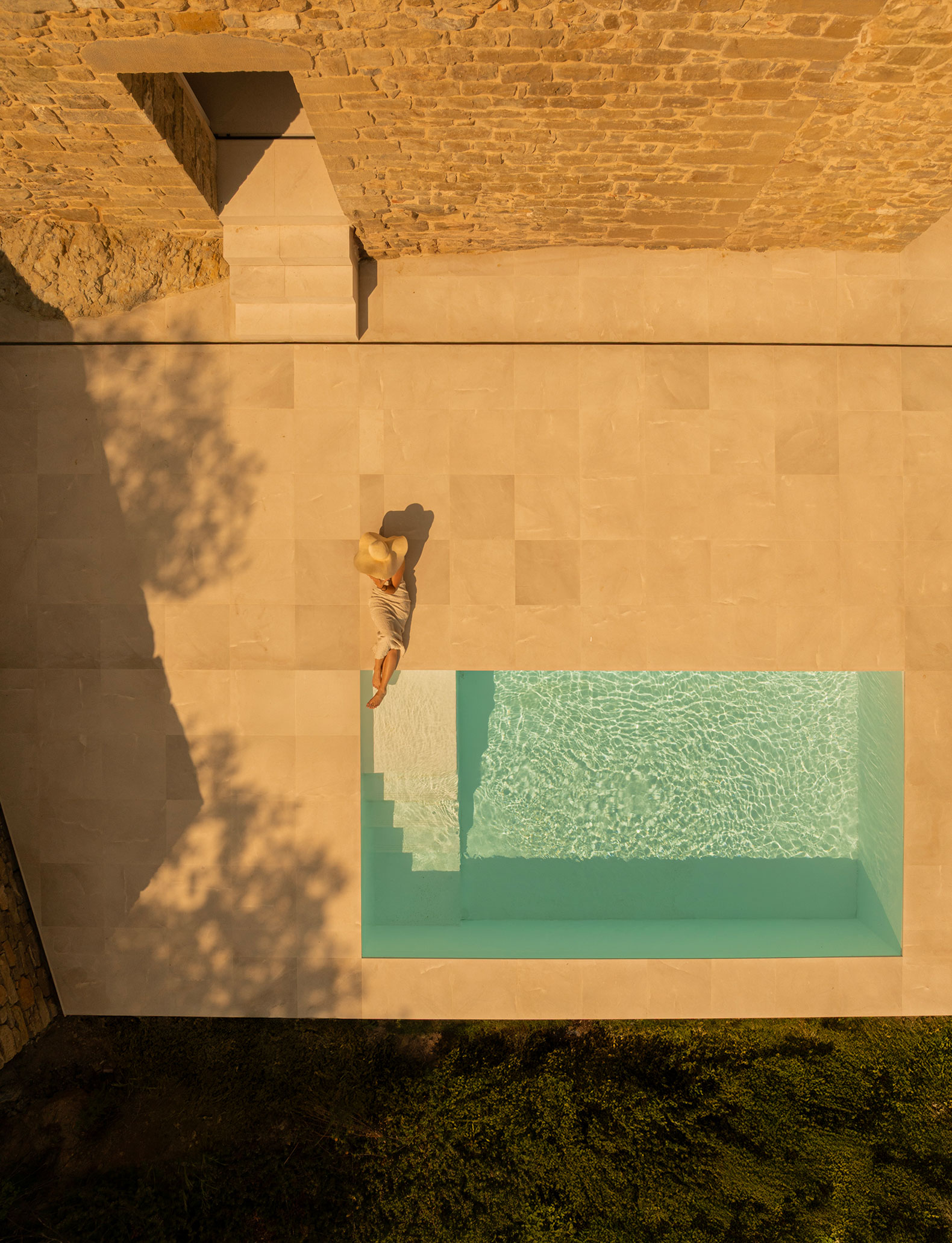 The house is completely self-sufficient in terms of energy and water. Thanks to the installation of photovoltaic panels with batteries and a system of custom-designed cisterns, the home achieves a high level of autonomy. One of the cisterns has been transformed into a pool for cooling off. The surrounding hectares of land, some of them cultivated, produce more than enough food to meet the needs of the British couple who live in the farmhouse.