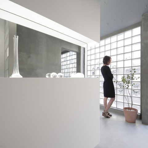 Jun Murata divides the interior spaces devoted to different functions by floors: the ground floor is where the most public part of the program is set: the showroom, while the features which require more privacy (warehouse, dwelling) are distributed on the upper floors. Lighting takes on paramount importance in this project: it leaks to the inside through a facade of glass bricks arranged with a specific distribution and is complemented with lighting slits which enhance the singular points of the rooms, as is the case of the the glass display window.