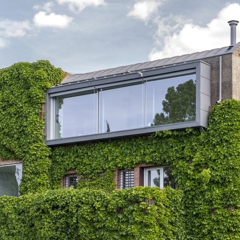 The house has 50 m² on the ground floor where the access, one bedroom and a bathroom are located, and the upper floor with 130 m² divided into two areas: the private area and the public area. The private area has a bedroom and a bathroom. In the public area, the kitchen, dining room and living room are located in one open room that extends to the outside with large windows to the north. This space also preserves a large circular skylight that previously illuminated the stairwell, which floods the entire room with light.