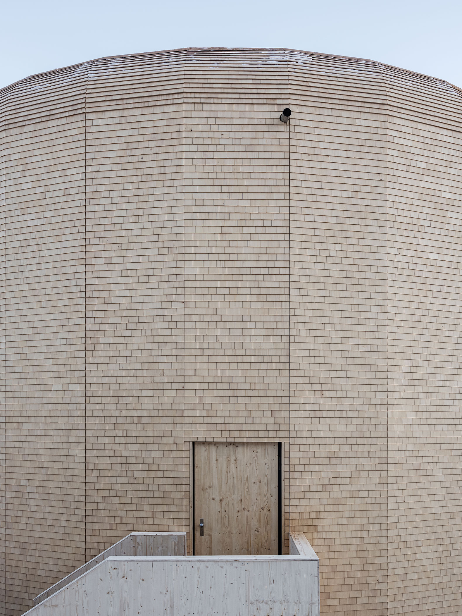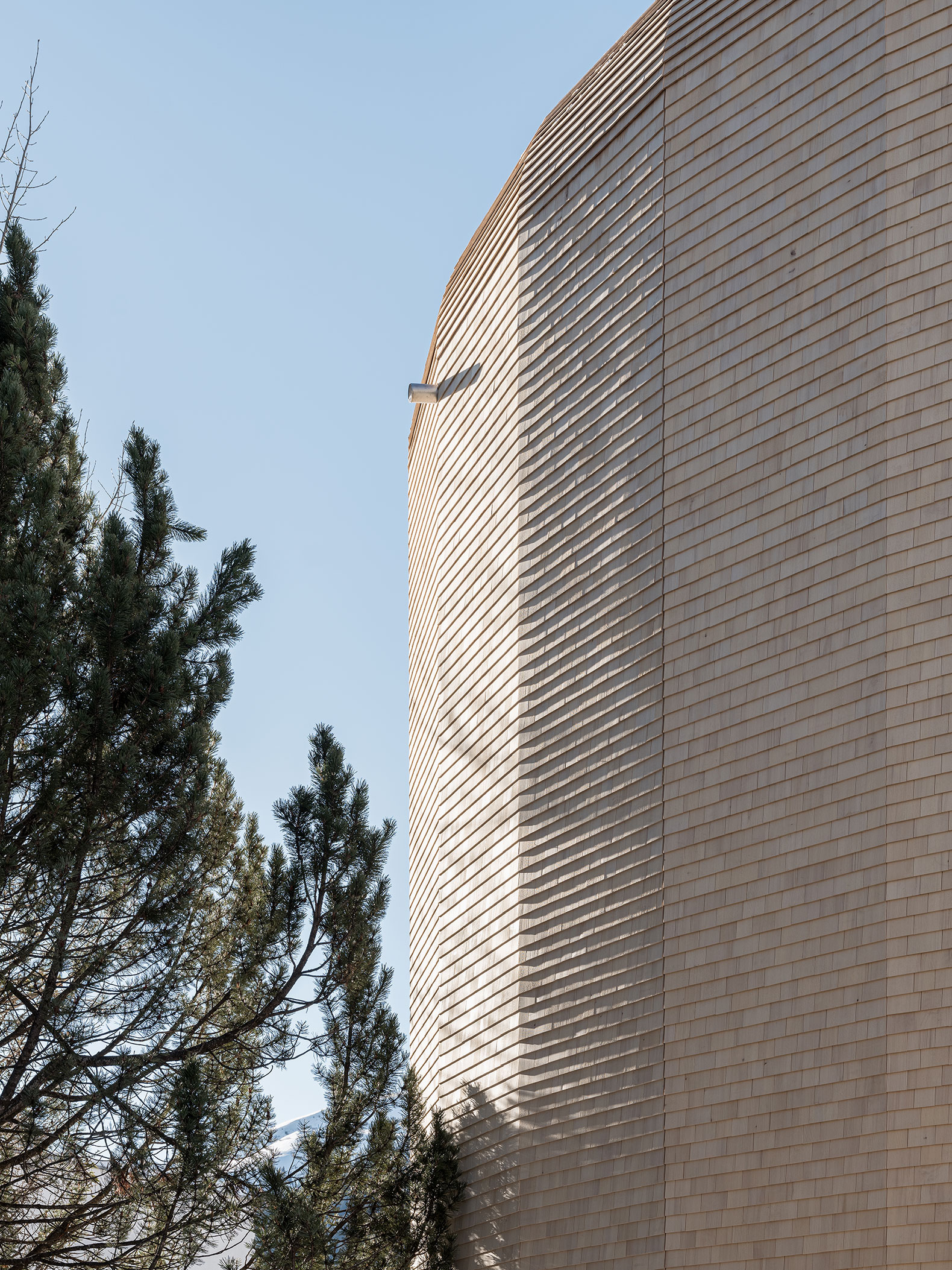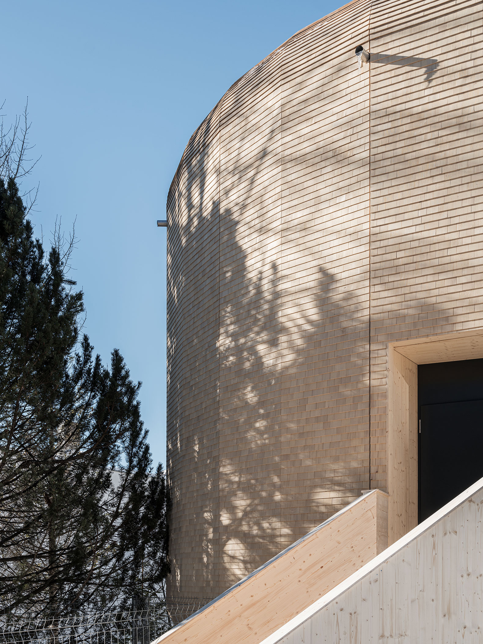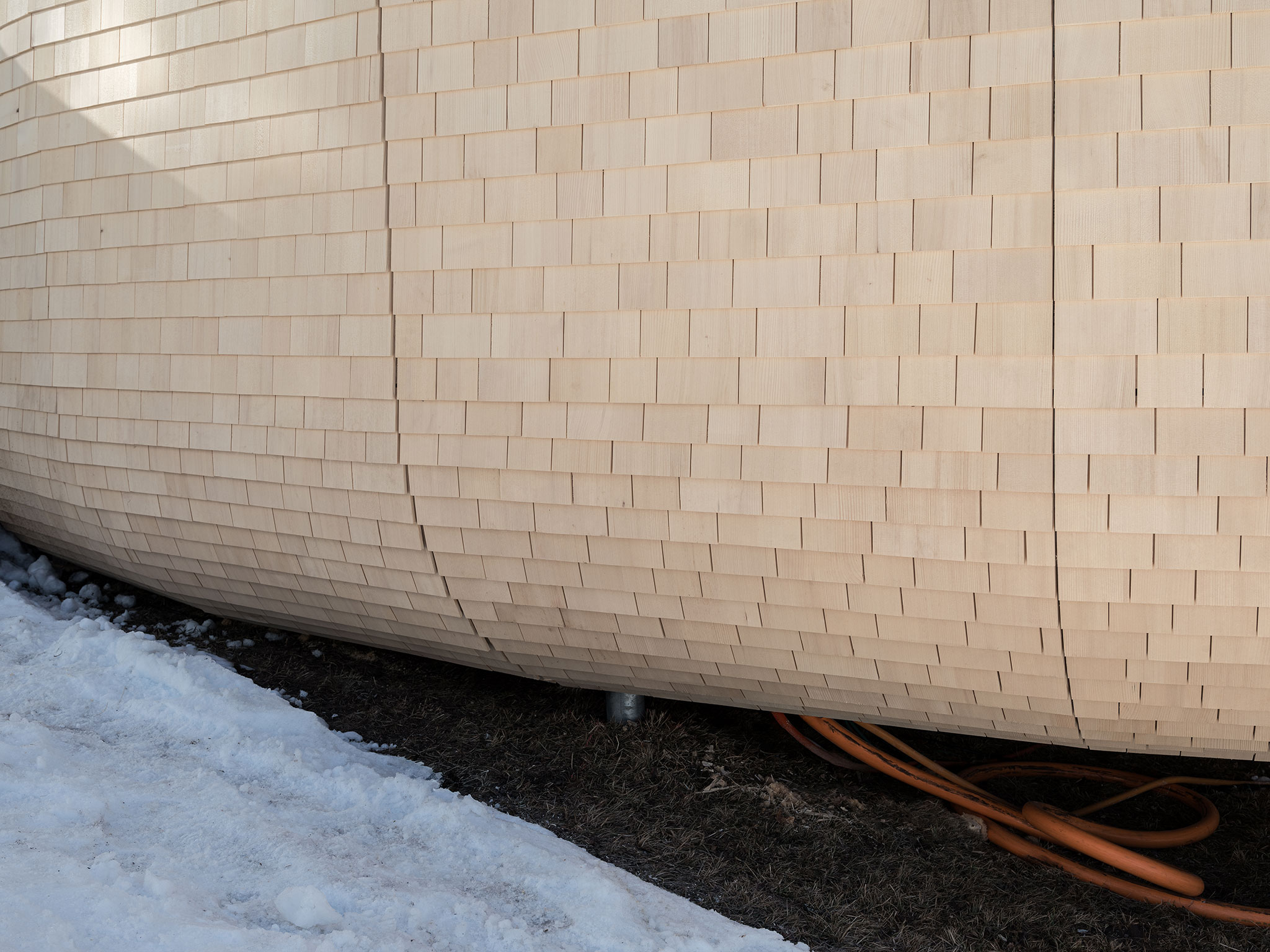 The primary material used is local Swiss wood, which insulates and ventilates the building for greater energy efficiency. On the exterior, the wood is used in the form of untreated shingles, symbolizing aging and change over time. For the foundation, Skrein Studios used screw piles to minimize footprints when dismantled. The building also features fast charging for electric vehicles, edge computing, and community spaces.
