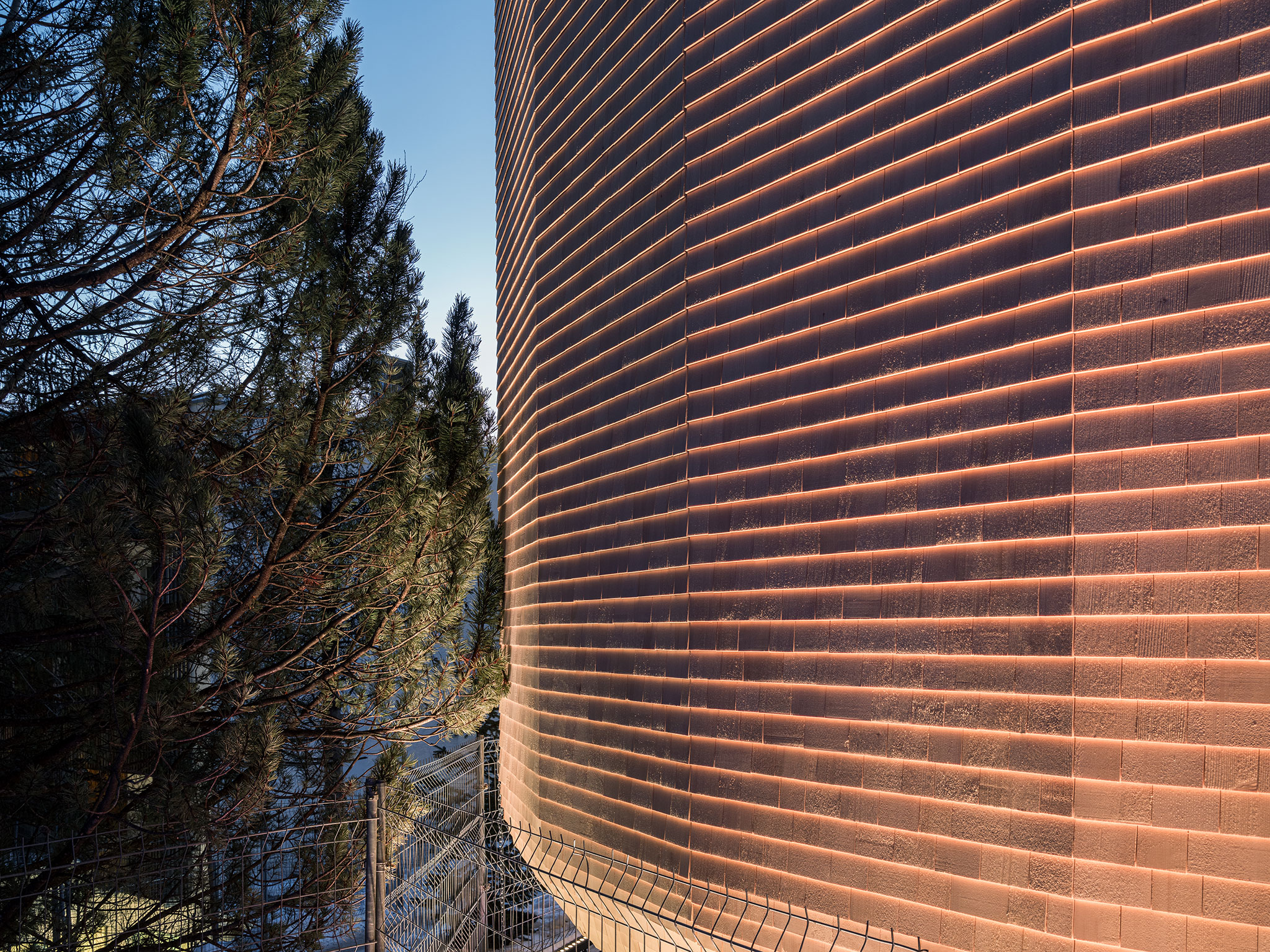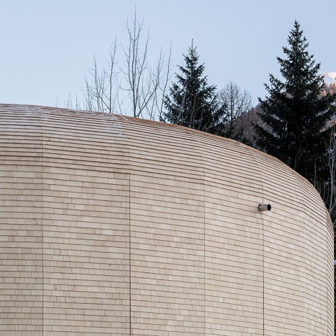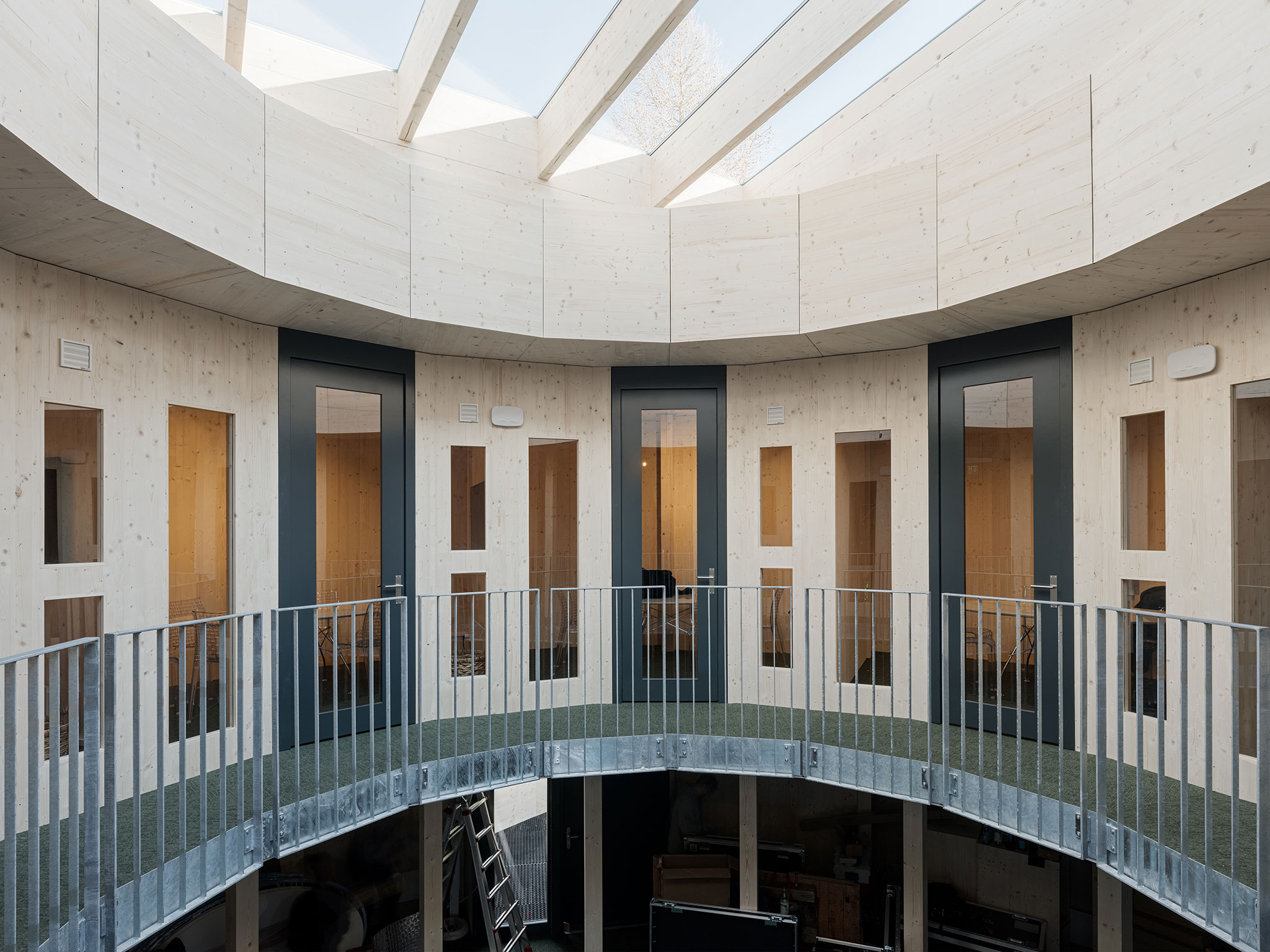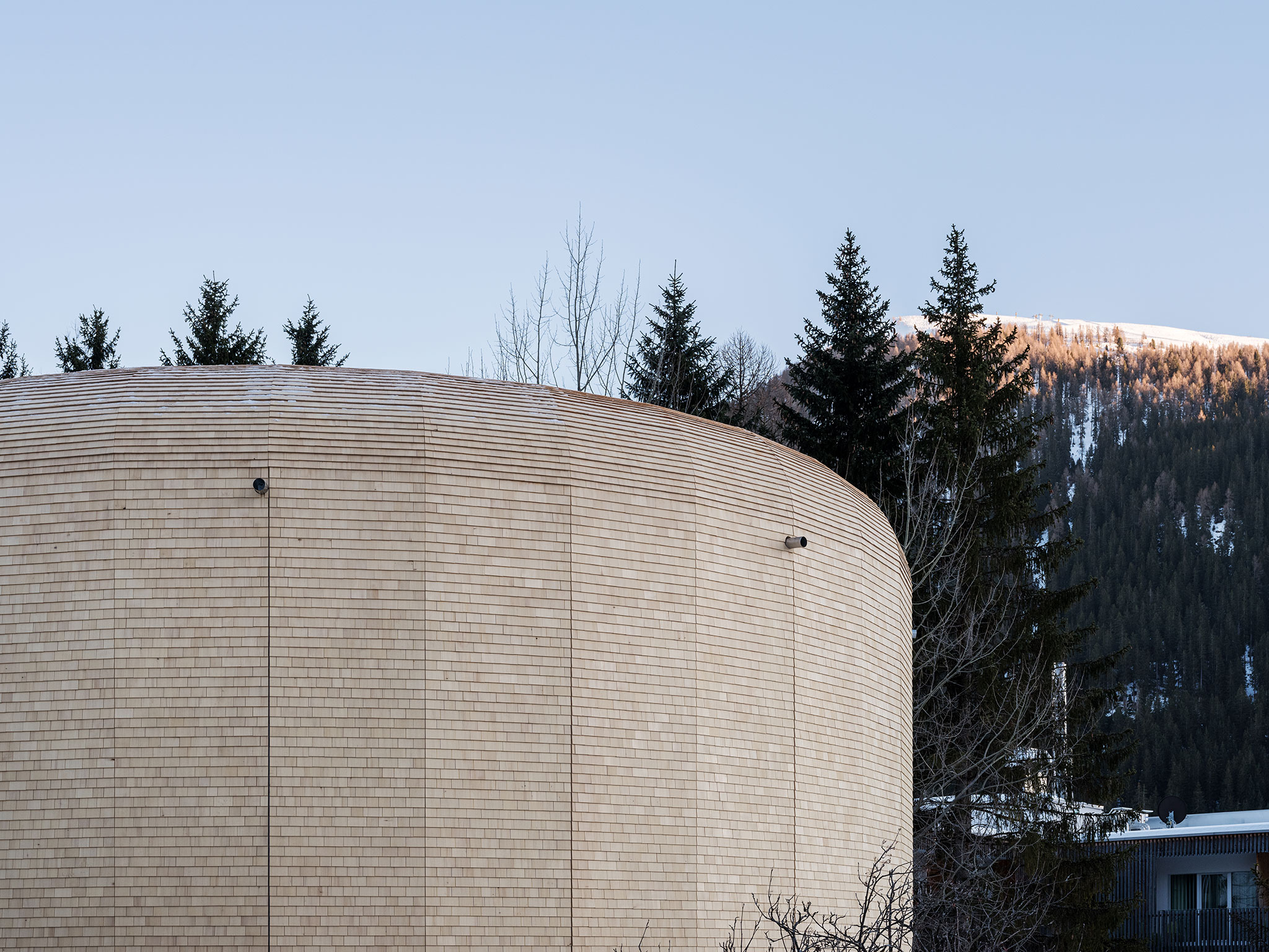 The primary material used is local Swiss wood, which insulates and ventilates the building for greater energy efficiency. On the exterior, the wood is used in the form of untreated shingles, symbolizing aging and change over time. For the foundation, Skrein Studios used screw piles to minimize footprints when dismantled. The building also features fast charging for electric vehicles, edge computing, and community spaces.